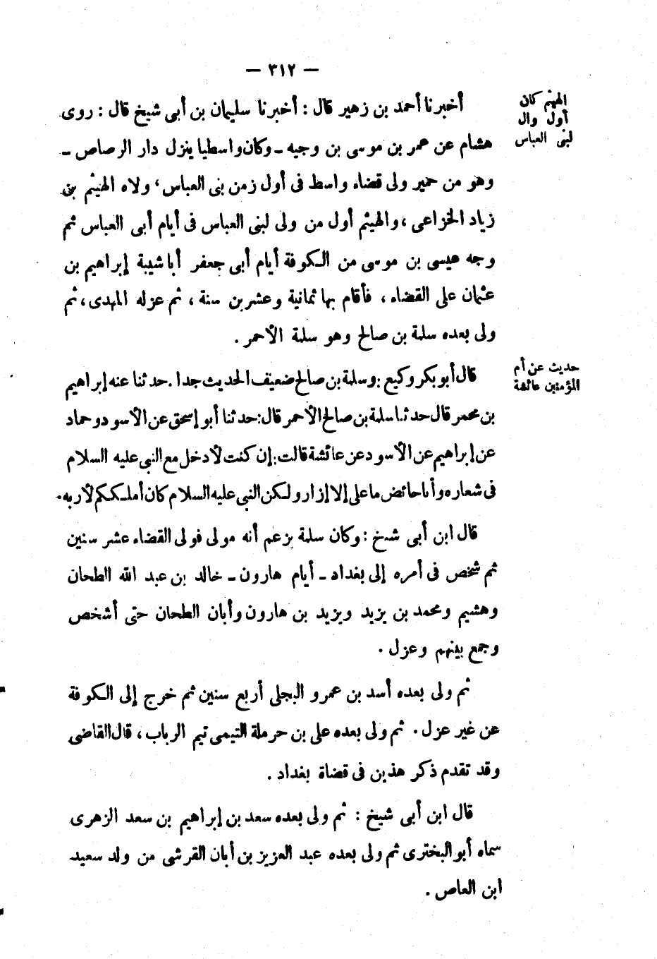 أَخْبَرَنَا أَحْمَد بْن زهير قال: أَخْبَرَنَا سليمان بْن أبي شيخ قال: روى هشام عَن عُمَر بْن موسى بْن وجيه وكان واسطياً ينزل دار الرصاص وهو من حمير ولي قضاء واسط في أول زمن بني العباس، ولاه الهيثم بْن زِيَاد الخزاعي، والهيثم أول من ولى لبني العباس في أيام أبي العباس ثم وجه عيسى بْن موسى من الكوفة أيام أبي جعفر أبا شيبة إبراهيم بْن عُثْمَان على القضاء، فأقام بها ثمانية وعشرين سنة، ثم عزله المهدي، ثم ولي بعده سلمة بْن صالح وهو سلمة الأحمر.