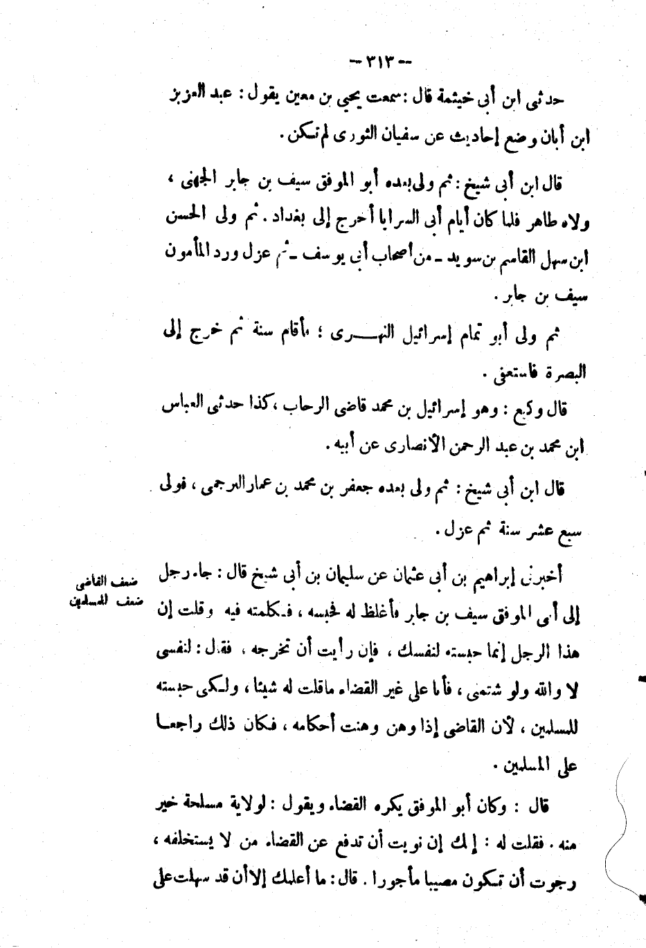 أَخْبَرَنِي إبراهيم بْن أبي عُثْمَان عَن سليمان بْن أبي شيخ قال: جاء رجل إِلَى أبي الموفق سيف بْن جابر فأغلظ له فحبسه، فكلمته فِيْهِ وقلت إن هَذَا الرجل إنما حبسته لنفسك، فإن رأيت أن تخرجه، فقال: لنفسي لا والله ولو شتمني، فأنا على غير القضاء ما قلت له شيئاً، ولكني حبسته للمسلمين، لأن القاضي إِذَا وهن وهنت أحكامه، فكان ذلك راجعاً على المسلمين. قال: وكان أَبُو الموفق يكره القضاء ويقول: لولاي مسلحة خير منه. فقلت له: إنك إن نويت أن تدفع عَن القضاء من لا يستخلفه، وجرت أن تكون مصيباً مأجوراً. قال: ما أعلمك إِلَّا أن قد سهلت علي.