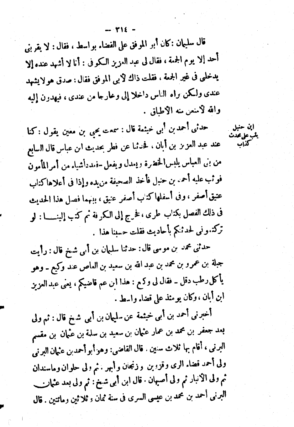 حَدَّثَنِي أَحْمَد بْن أبي خيثمة قال: سمعت يحيى بْن معين يقول: كنا عند عَبْد العزيز بْن أبان، فحَدَّثَنَا عَن فطر بحديث ابْن عَبَّاس قَالَ: السابع من بني العباس يلبس الخضرة ويعدل ويفعل فعدد أشياء من أمر المأمون فوثب عليه أَحْمَد بْن حنبل فأخذ الصحيفة من يده وإذا في أعلاها كتاب عتيق أصفر، وفي أسفلها كتاب أصفر عتيق، بينهما فصل هَذَا الحديث في ذلك الفصل بكتاب طري، فخرج إِلَى الكوفة ثم كتب إلينا: لو تركتموني لحدثتكم بأحاديث فقلت حسبنا هَذَا.