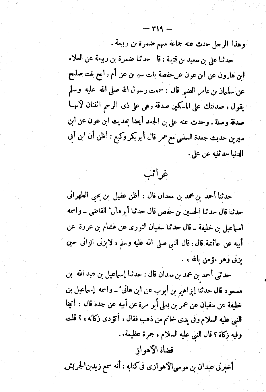 حَدَّثَنَا أَحْمَدبن مُحَمَّدبن معدان قال: أظن عقيل بْن يحيى الطهراني حَدَّثَنَا قَالَ: حَدَّثَنَا الحسين بْن حفص قَالَ: حَدَّثَنَا أَبُو هانئ القاضي واسمه إسماعيل بْن خليفة قَالَ: حَدَّثَنَاسُفْيَان الثوري عَن هشام بْن عروة عَن أبيه عَن عَائِشَة قال: قَالَ: النَّبِيُّ صَلَّى اللَّهُ عَلَيْهِ وَسَلَّمَ: لا يزني الزاني حين يزني وهو مؤمن بالله.