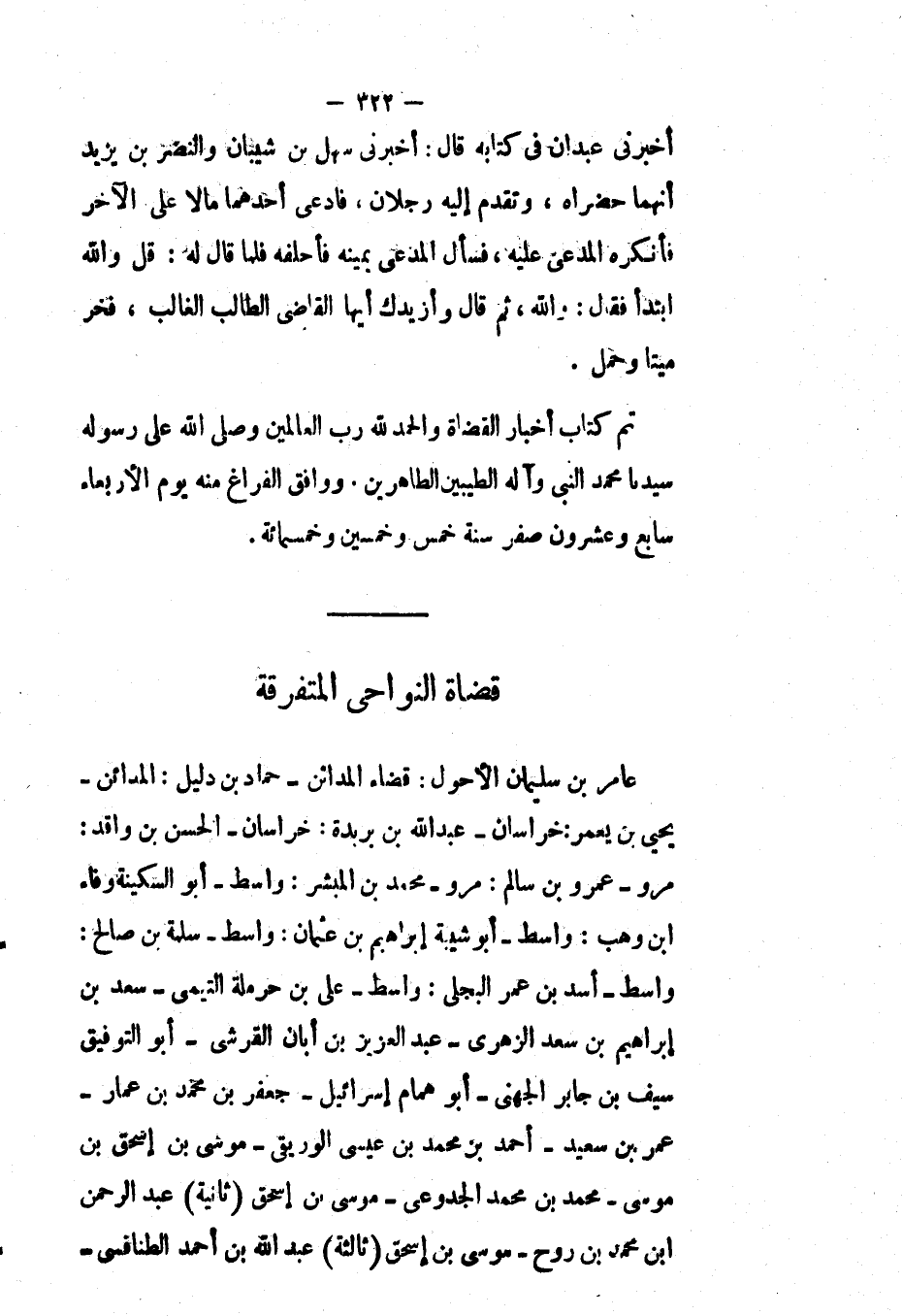 تم كتاب أخبار القضاة والحمد لله رب العالمين. وصلى الله على رسوله سيدنا مُحَمَّد النبي وآله الطيبين الطاهرين.