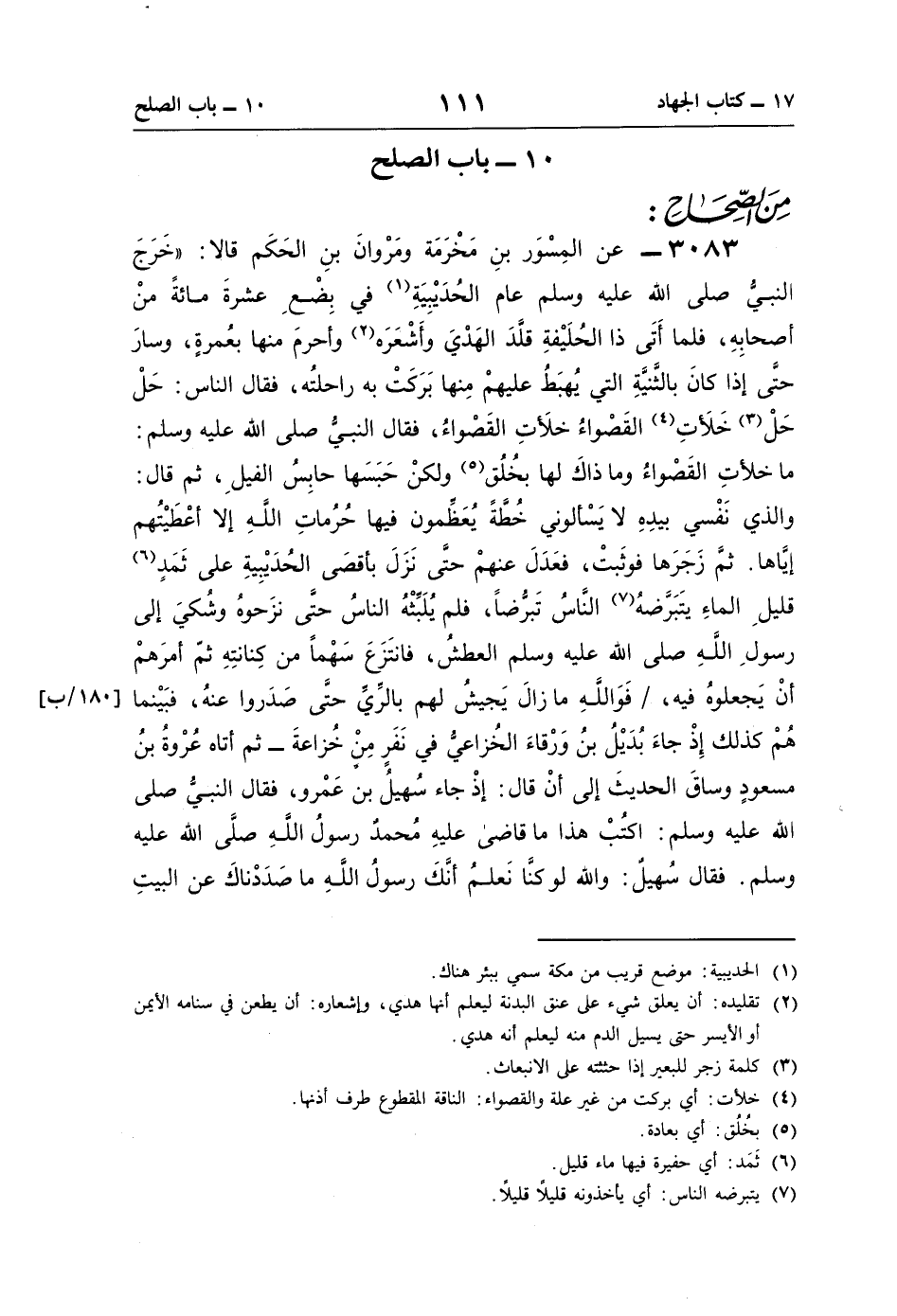 3083 - عن المِسْوَر بنِ مَخْرَمَة ومَرْوانَ بنِ الحَكَم قالا: "خَرَجَ النبيُّ صلى اللَّه عليه وسلم عام الحُدَيْبِيَةِ (¬1) في بِضْعِ عشرةَ مائةً منْ أصحابِهِ، فلما أَتَى ذا الحُلَيْفةِ قلَّدَ الهَدْيَ وأَشْعَرَه (¬2) وأحرمَ منها بعُمرةٍ، وسارَ حتَّى إذا كانَ بالثَّنيَّةِ التي يُهبَط عليهمْ مِنها بَرَكَتْ به راحلتُه، فقال النَّاس: حَلْ حَلْ (¬3) خَلَأتِ (¬4) القَصْواءُ خلَأتِ القَصْواءُ، فقال النَّبيُّ صلى اللَّه عليه وسلم: ما خلأتِ القَصْواءُ وما ذاكَ لها بخُلُق (¬5) ولكنْ حَبَسَها حابِسُ الفيلِ، ثمَّ قال: والذي نَفْسي بيدِهِ لا يَسْألوني خُطَّةً يُعَظِّمون فيها حُرُماتِ اللَّه إلَّا أعْطَيْتُهم إيَّاها. ثمَّ زَجَرَها فوثَبتْ، فعَدَلَ عنهمْ حتَّى نَزَلَ بأقصَى الحُدَيْبِيةِ على ثَمَدٍ (¬6) قليلِ الماءِ يتَبَرَّضهُ (¬7) النَّاسُ تَبرُّضًا، فلم يُلَبِّثْهُ النَّاسُ حتَّى نزَحوهُ وشُكيَ إلى رسولِ اللَّه صلى اللَّه عليه وسلم العطشُ، فانتَزَعَ سَهْمًا من كِنانتِهِ ثمّ أمرَهمْ أنْ يَجعلوهُ فيه، فَوَاللَّهِ ما زالَ يَجيشُ لهم بالرِّيِّ حتَّى صَدَروا عنهُ، فبَيْنما هُمْ كذلك إِذْ جاءَ بُدَيْل بنُ وَرْقاءَ الخُزاعيُّ في نَفَرٍ مِنْ خُزاعةَ -ثم أتاه عُرْوةُ بنُ مسعودٍ وساقَ الحديثَ إلى أنْ قال: إذْ جاء سُهيلُ بن عَمْرو، فقال النَّبِيُّ صلى اللَّه عليه وسلم: اكتُبْ هذا ما قاضى عليهِ مُحمدٌ رسولُ اللَّهِ صلَّى اللَّه عليه وسلم. فقال سُهيلٌ: واللَّه لو كنَّا نَعلمُ أنَّكَ رسولُ اللَّهِ ما صَدَدْناكَ عن البيتِ