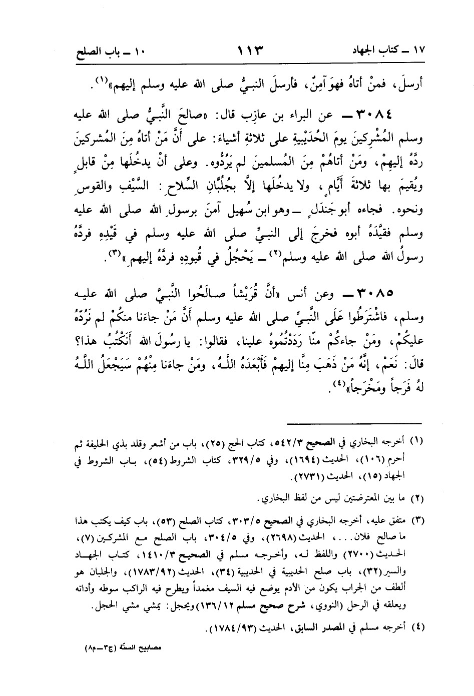 3084 - عن البراء بن عازِب قال: "صالحَ النَّبيُ صلى اللَّه عليه وسلم المُشْرِكينَ يومَ الحُدَيْبيةِ على ثلاثةِ أشياءَ: على أَنَّ مَنْ أتاهُ مِنَ المُشركينَ ردَّهُ إليهِمْ، ومَنْ أتاهُمْ مِنَ المُسلمينَ لم يَرُدُّوه. وعلى أنْ يدخُلَها مِنْ قابلٍ ويُقيمَ بها ثلاثةَ أَيَّامٍ، ولا يدخُلَها إلَّا بجُلُبَّانِ السِّلاحِ: السَّيْفِ والقوسِ ونحوه. فجاءه أبو جَندَلٍ -وهو ابن سُهيل آمنَ برسولِ اللَّه صلى اللَّه عليه وسلم فقيَّدَهُ أبوه فخرجَ إلى النَّبِيِّ صلى اللَّه عليه وسلم في قَيْدِهِ فردَّهُ رسولُ اللَّه صلى اللَّه عليه وسلم (¬2) -يَحْجُلُ في قُيودِهِ فردَّهُ إليهمِ" (¬3).