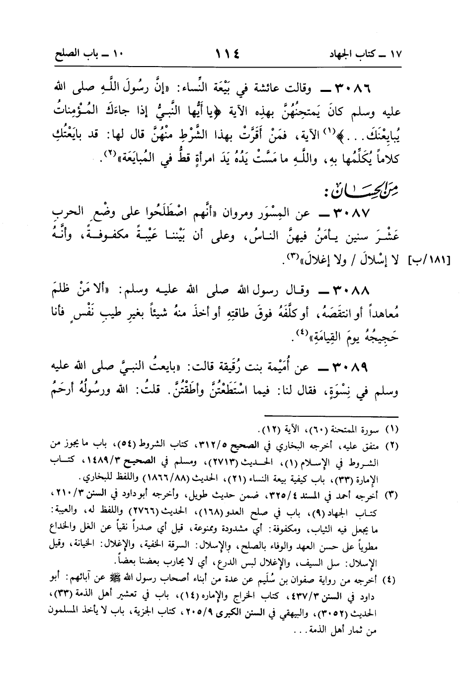 3087 - عن المِسْوَر ومروان "أنَّهم اصْطَلَحُوا على وضْعِ الحربِ عَشْرَ سنين يأمَنُ فيهنَّ النَّاسُ، وعلى أن بَيْننا عَيْبةً مكفوفةً، وأنَّهُ لا إسْلالَ ولا إغلالَ" (¬3).