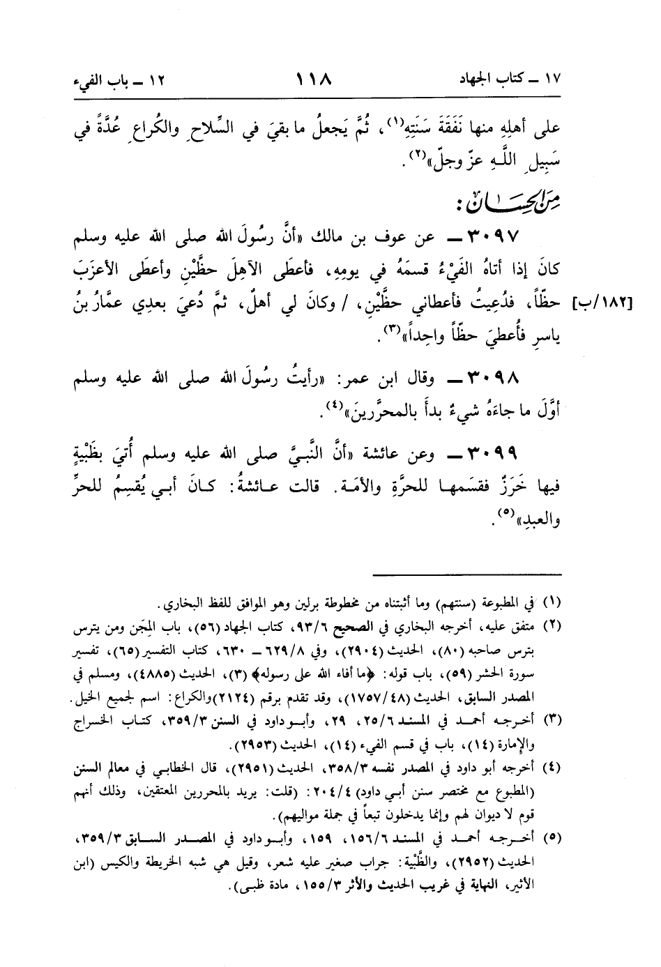 3097 - عن عوف بن مالك "أنَّ رسُولَ اللَّه صلى اللَّه عليه وسلم كانَ إذا أتاهُ الفَيْءُ قسمَهُ في يومِهِ، فأعطَى الَأهِلَ حظَّيْنِ وأعطَى الأعزَبَ حظًّا، فدُعِيتُ فأعطاني حظَّيْنِ، وكانَ لي أهلٌ، ثَمَّ دُعيَ بعدِي عمَّارُ بنُ ياسرِ فأُعطيَ حظًّا واحِدًا" (¬3).