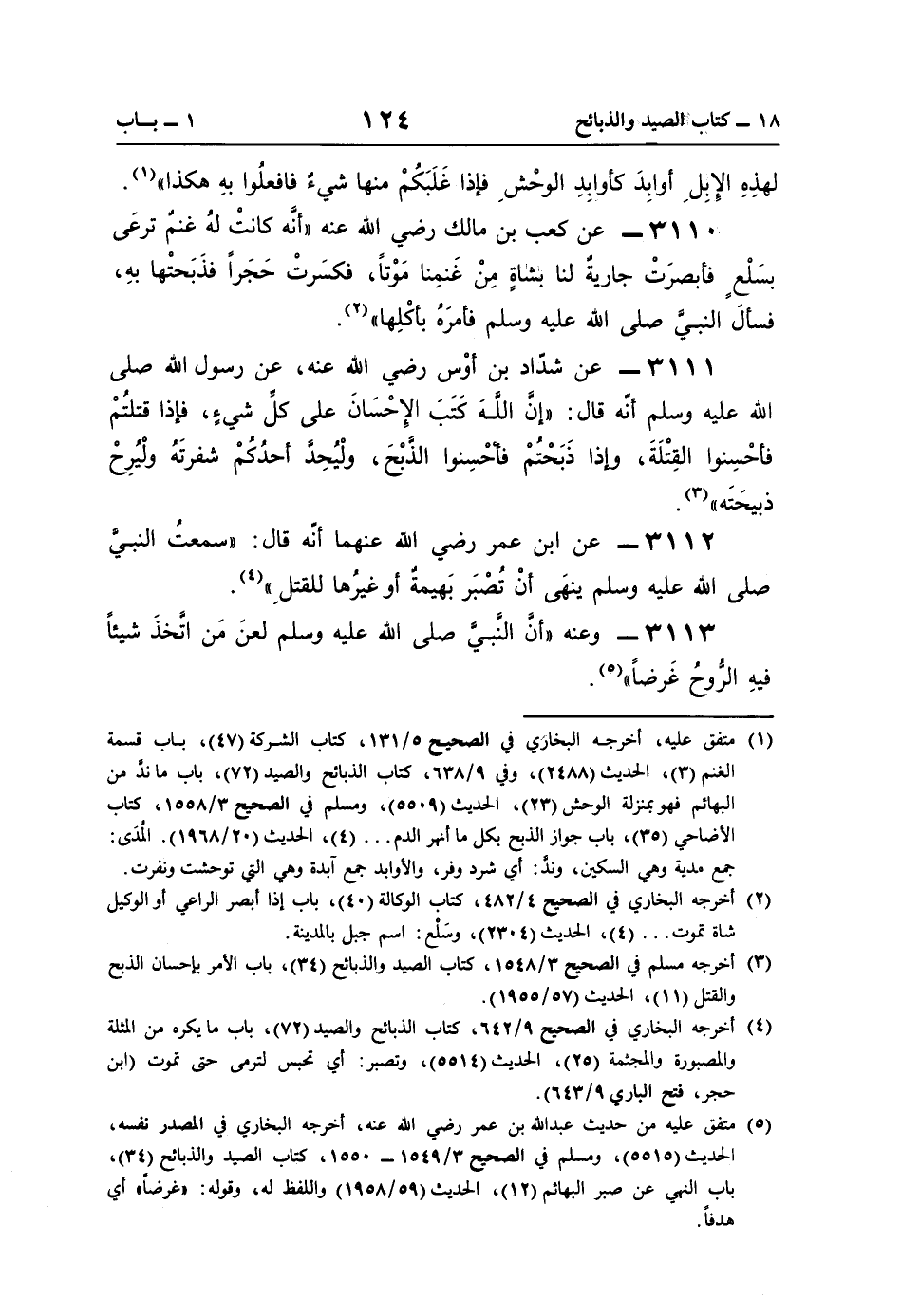 (¬4) أخرجه البخاري في الصحيح 9/ 642، كتاب الذبائح والصيد (72)، باب ما يكره من المثلة والمصبورة والمجثمة (25)، الحديث (5514)، وتصبر: أي تحبس لترمى حتَّى تموت (ابن حجر، فتح الباري 9/ 643).