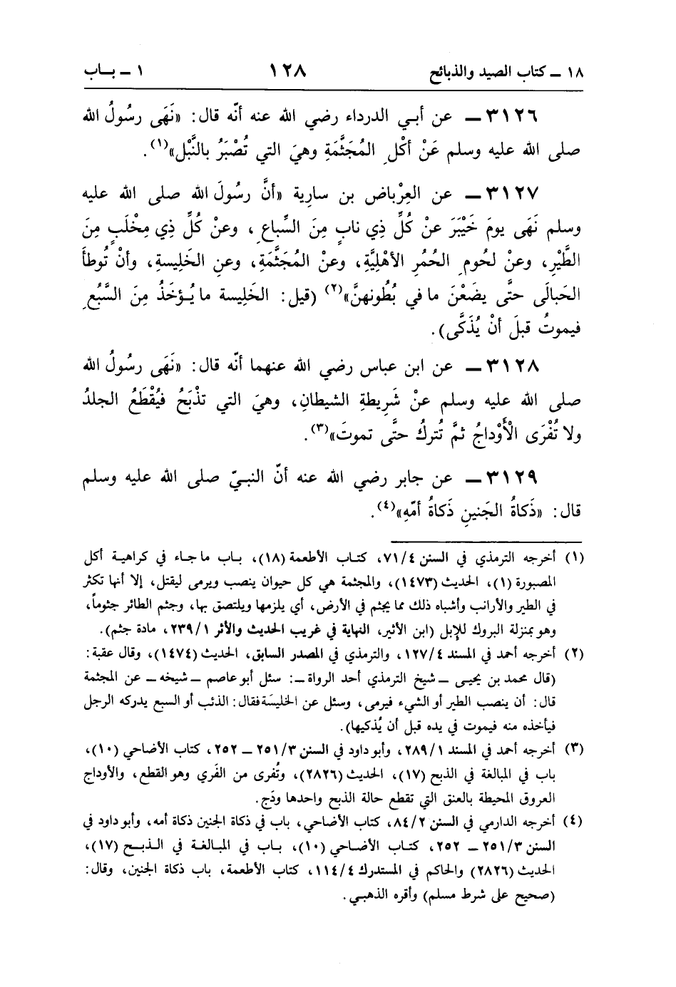 3129 - عن جابر رضي اللَّه عنه أنّ النَّبيّ صلى اللَّه عليه وسلم قال: "ذَكاةُ الجَنينِ ذَكاةُ أمّهِ" (¬4).