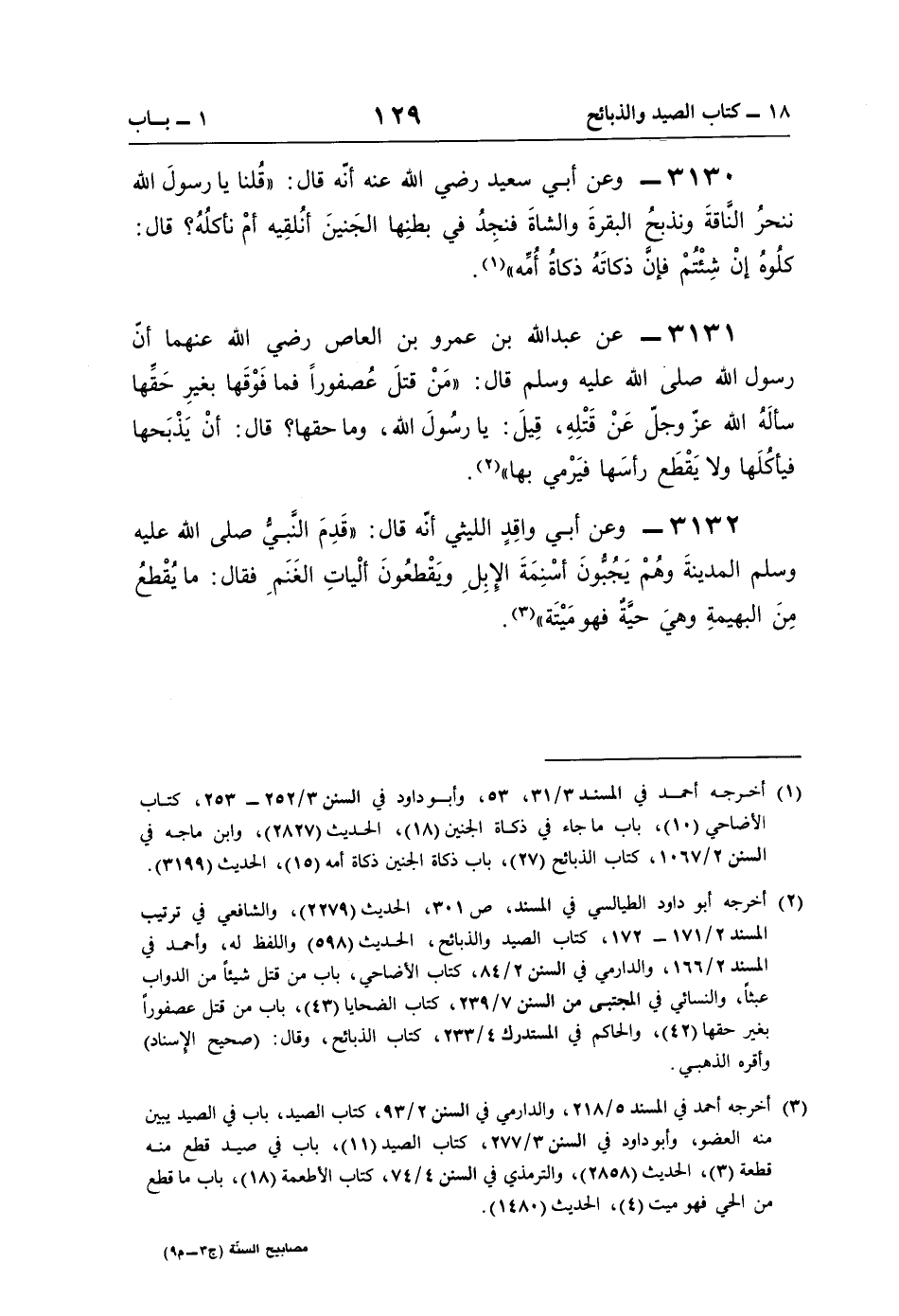 3132 - وعن أبي واقِدٍ الليثي أنّه قال: "قَدِمَ النَّبيُّ صلى اللَّه عليه وسلم المدينةَ وهُمْ يَجُبُّونَ أسْنِمَةَ الإِبِلِ ويَقْطعُونَ ألْياتِ الغَنَمِ فقال: ما يُقْطعُ مِنَ البهيمةِ وهيَ حيَّةٌ فهو مَيْتَة" (¬3).