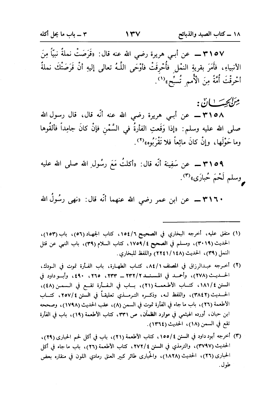 (¬3) أخرجه أبود داود في السنن 4/ 155، كتاب الأطعمة (21)، باب في أكل لحم الحبارى (29)، الحديث (3797)، والترمذي في السنن 4/ 272، كتاب الأطعمة (26)، باب ما جاء في أكل الحبارى (26)، الحديث (1828)، والحُبارى طائر كبير العنق رمادي اللون في منقاره بعض طول.