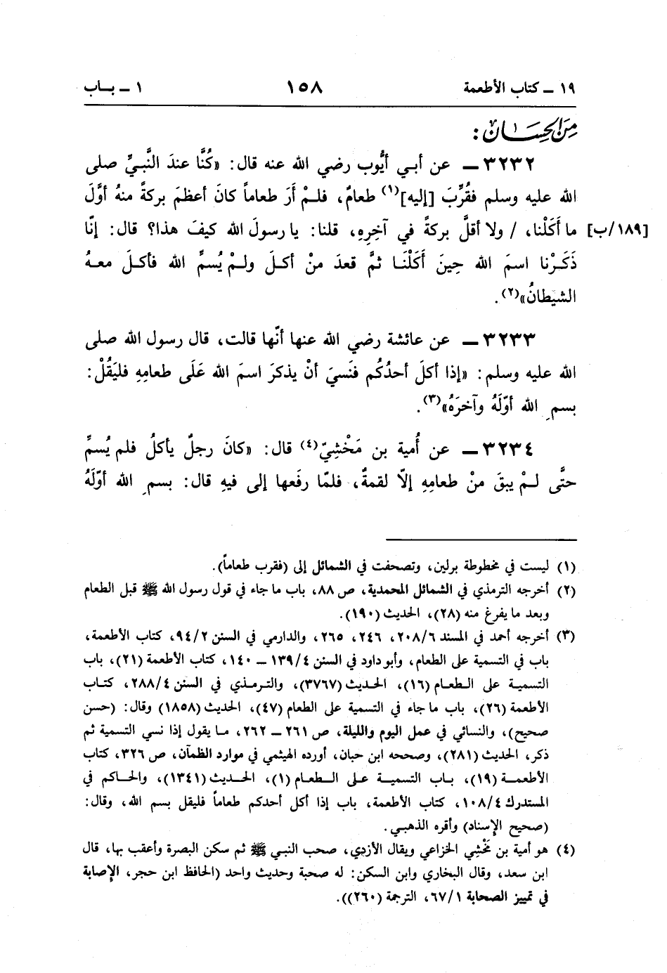 3234 - عن أُمية بن مَخْشِيّ (¬4) قال: "كانَ رجلٌ يأكلُ فلم يُسمِّ حتَّى لمْ يبقَ منْ طعامِهِ إلّا لقمة، -فلمَّا رفَعها إلى فيهِ قال: بسمِ اللَّه أوّلَهُ