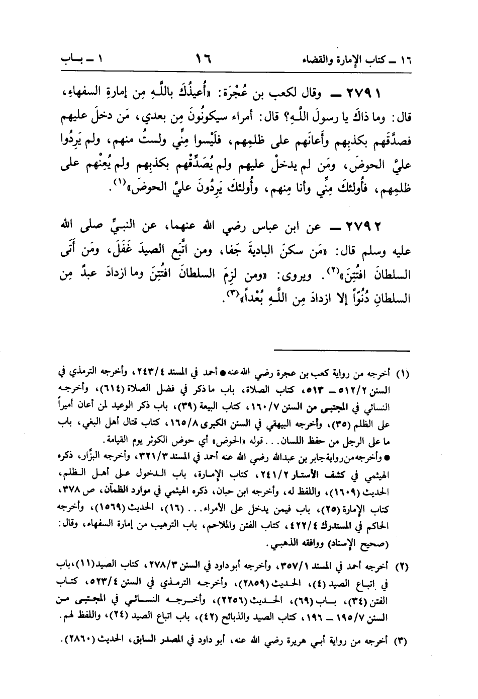 2792 - عن ابن عباس رضي اللَّه عنهما، عن النَّبيِّ صلى اللَّه عليه وسلم قال: "مَن سكنَ الباديةَ جَفا، ومن اتَّبَع الصيدَ غَفَلَ، ومَن أَتَى السلطانَ افتُتِنَ" (¬2). ويروى: "ومن لزِمَ السلطانَ افتُتِنَ وما ازدادَ عبدٌ مِن السلطانِ دُنُوًّا إلّا ازدادَ مِن اللَّهِ بُعْدًا" (¬3).