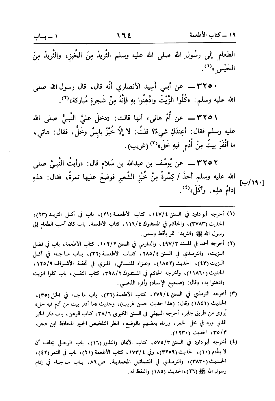 3252 - عن يُوسُف بن عبد اللَّه بن سَلام قال: "رأيتُ النَّبيَّ صلى اللَّه عليه وسلم أخذَ كِسْرةً مِنْ خُبْزِ الشَّعيرِ فوضعَ عليها تمرةً، فقال: هذهِ إدامُ هذِه. وأكَلَ" (¬4).