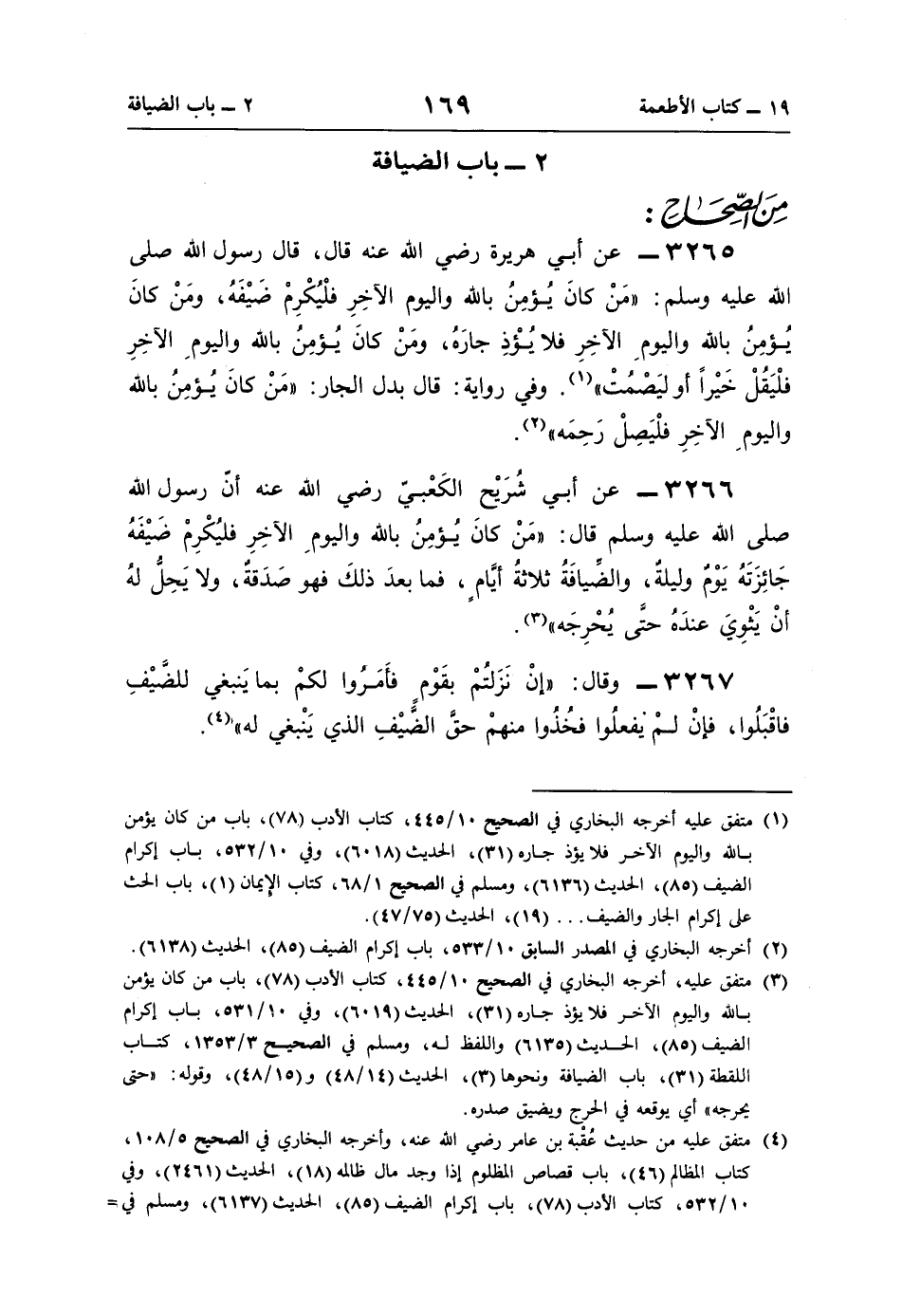 (¬3) متفق عليه، أخرجه البخاري في الصحيح 10/ 445، كتاب الأدب (78)، باب من كان يؤمن باللَّه واليوم الآخر فلا يؤذ جاره (31)، الحديث (6019)، وفي 10/ 531، باب إكرام الضيف (85)، الحديث (6135) واللفظ له، ومسلم في الصحيح 3/ 1353، كتاب اللقطة (31)، باب الضيافة ونحوها (3)، الحديث (14/ 48) و (15/ 48)، وقوله: "حتَّى يحرجه" أي يوقعه في الحرج ويضيق صدره.