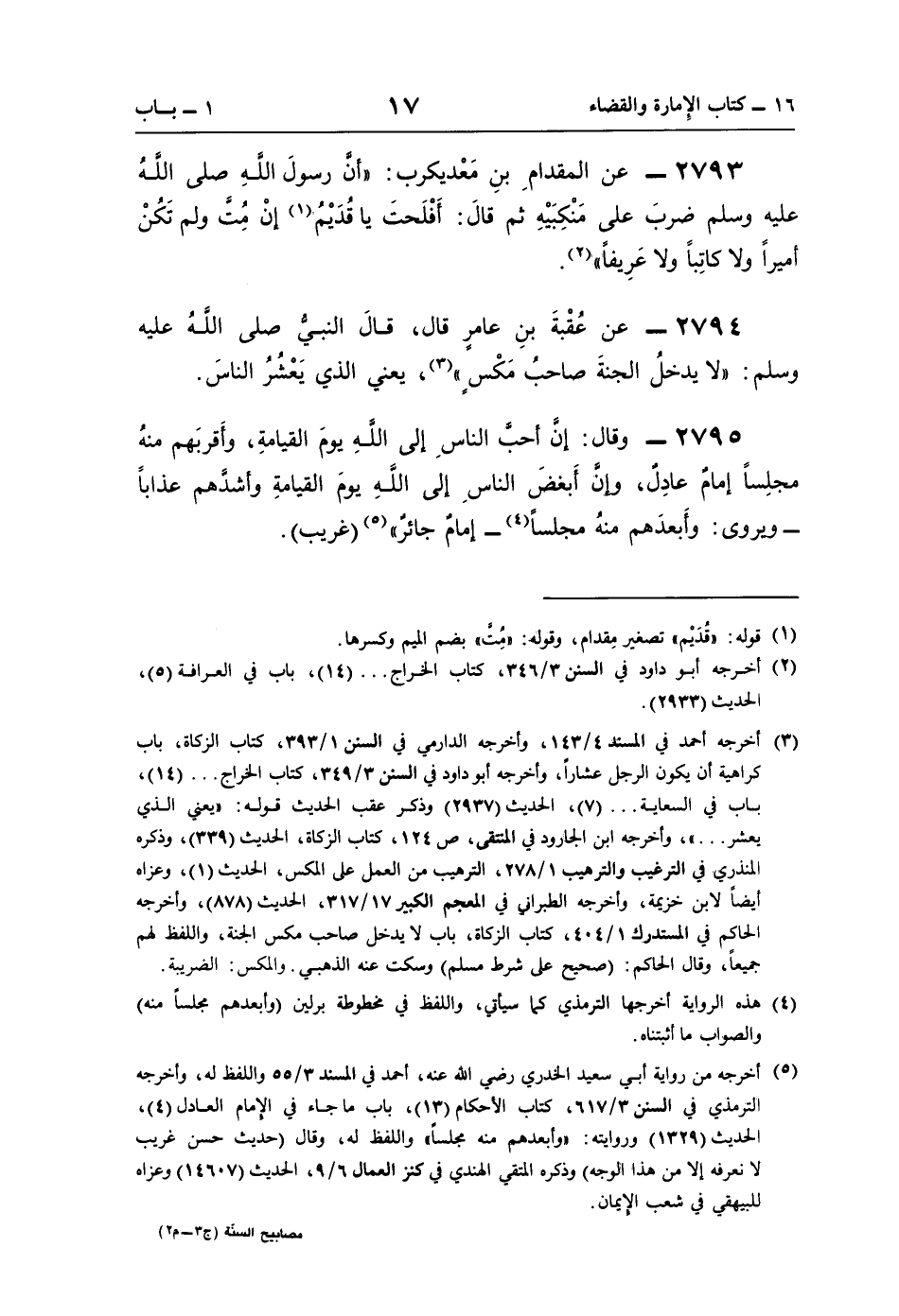 2793 - عن المقدامِ بنِ مَعْديكرب: "أنَّ رسولَ اللَّهِ صلى اللَّهُ عليه وسلم ضربَ على مَنْكِبَيْهِ ثم قالَ: أَفْلَحتَ يا قُدَيْمُ (¬1) إنْ مُتَّ ولم تَكُنْ أميرًا ولا كاتِبًا ولا عَرِيفًا" (¬2).