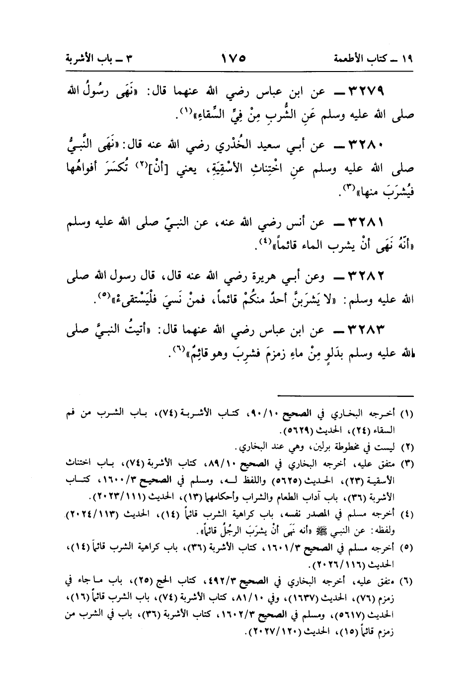 3283 - عن ابن عباس رضي اللَّه عنهما قال: "أتيتُ النبيَّ صلى اللَّه عليه وسلم بدَلوٍ مِنْ ماءِ زمزمَ فشرِبَ وهو قائِمٌ" (¬6).