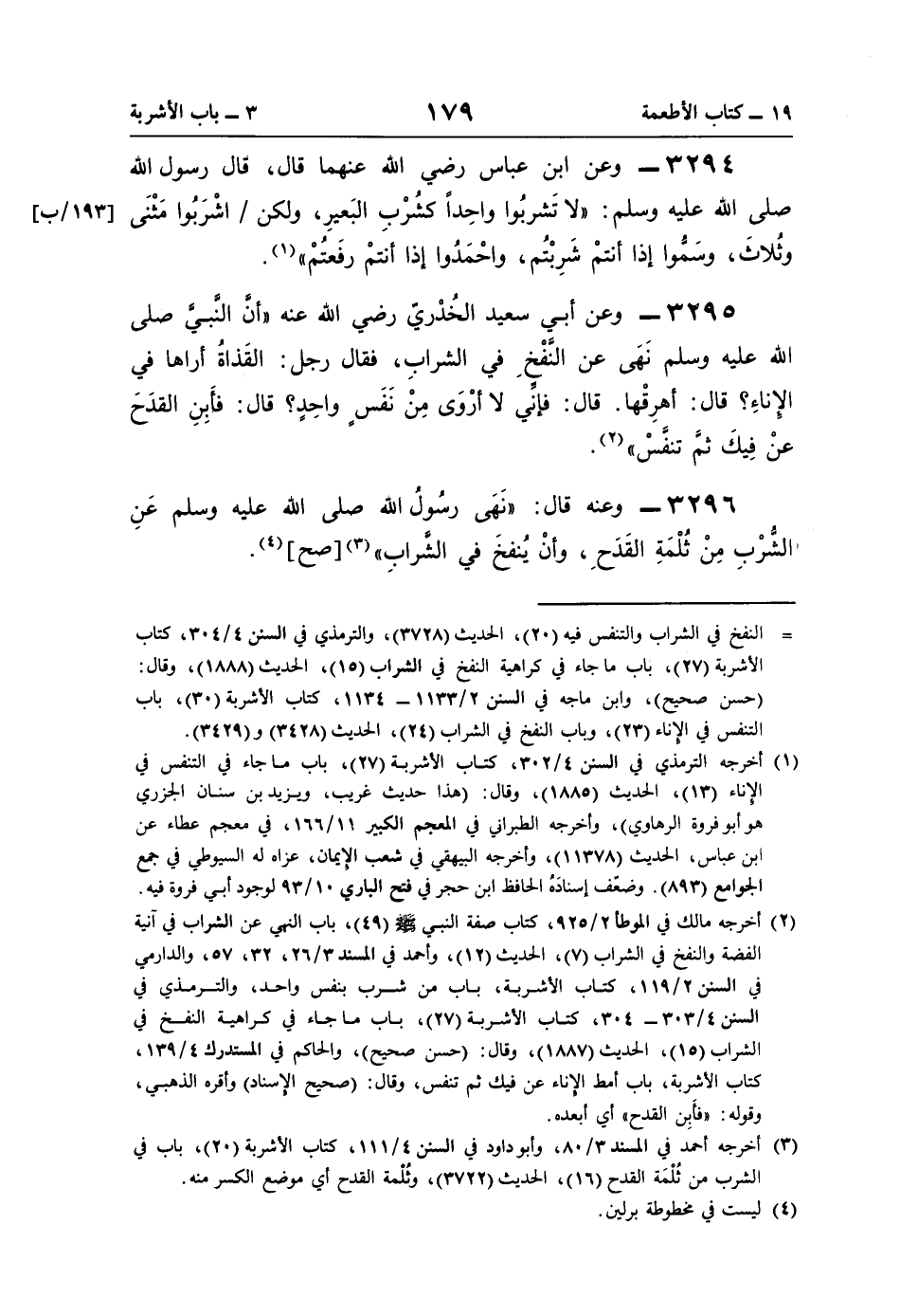 3296 - وعنه قال: "نَهَى رسُولُ اللَّه صلى اللَّه عليه وسلم عَنِ الشُّرْبِ مِنْ ثُلْمَةِ القَدَحِ، وأنْ يُنفخَ في الشَّرابِ" (¬3) [صح] (¬4).