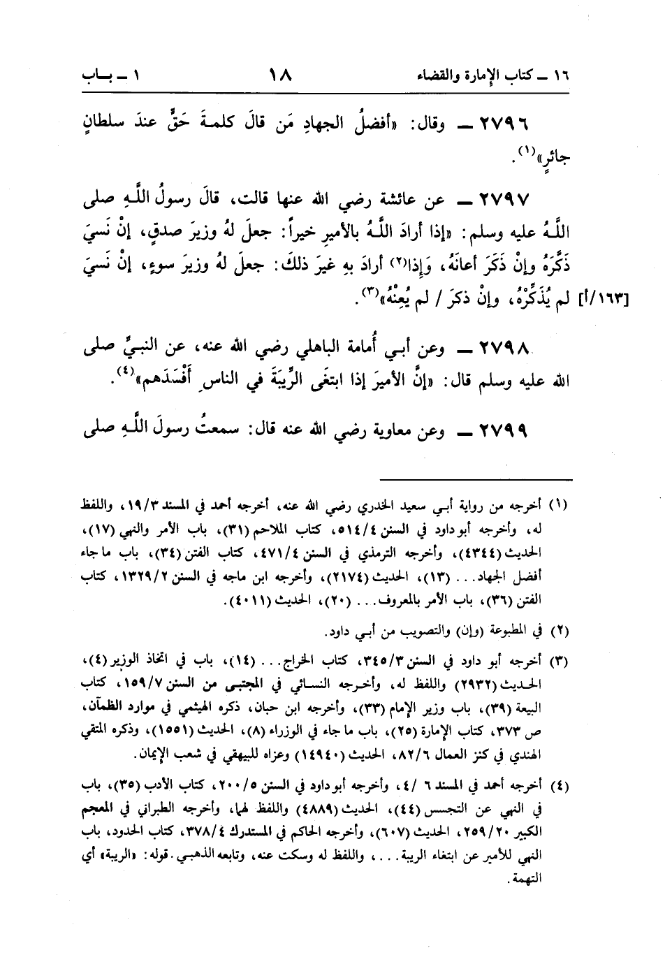 2797 - عن عائشة رضي اللَّه عنها قالت، قالَ رسولُ اللَّهِ صلى اللَّهُ عليه وسلم: "إذا أرادَ اللَّهُ بالأميرِ خيرًا: جعلَ لهُ وزيرَ صدقٍ، إنْ نَسيَ ذَكَّرَهُ وإنْ ذَكَرَ أعانَهُ، وَإِذا (¬2) أرادَ بهِ غيرَ ذلكَ: جعلَ لهُ وزيرَ سوءٍ إنْ نَسيَ لم يُذَكِّرْهُ، وإنْ ذكرَ لم يُعِنْهُ" (¬3).