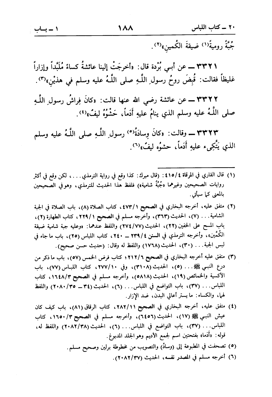 3321 - عن أبي بُرْدة قال: "أخرجَتْ إلينا عائشةُ كساءً مُلَبَّدًا وإزارًا غليظًا فقالت: قُبِضَ روحُ رسولِ اللَّهِ صلى اللَّهُ عليه وسلم في هذيْنِ" (¬3).