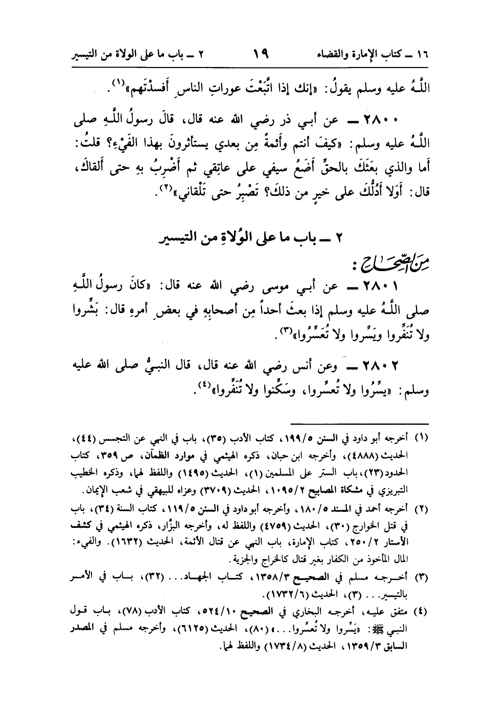 2801 - عن أبي موسى رضي اللَّه عنه قال: "كانَ رسولُ اللَّهِ صلى اللَّه عليه وسلم إذا بعثَ أحدًا مِن أصحابِهِ في بعضِ أمرهِ قال: بَشِّروا ولا تُنَفِّروا ويَسِّروا ولا تُعَسِّرُوا" (¬3).