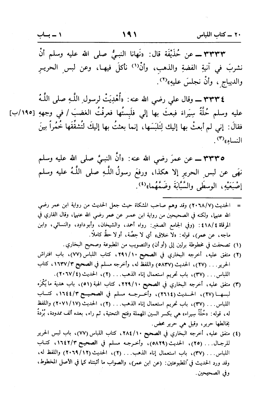 3333 - عن حُذَيْفَة قال: "نَهانا النبيُّ صلى اللَّه عليه وسلم أنْ نشربَ في آنيةِ الفضةِ والذهبِ، وأنْ (¬1) نأكلَ فيها، وعن لبسِ الحريرِ والديباجِ، وأنْ نجلسَ عليهِ" (¬2).