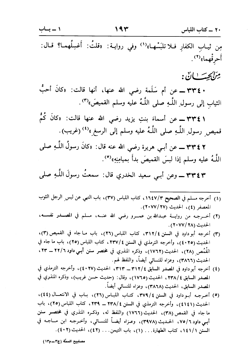 3342 - عن أبي هريرة رضي اللَّه عنه قال: "كانَ رسولُ اللَّهِ صلى اللَّهُ عليه وسلم إذا لبسَ القميصَ بدأَ بميامِنِهِ" (¬5).