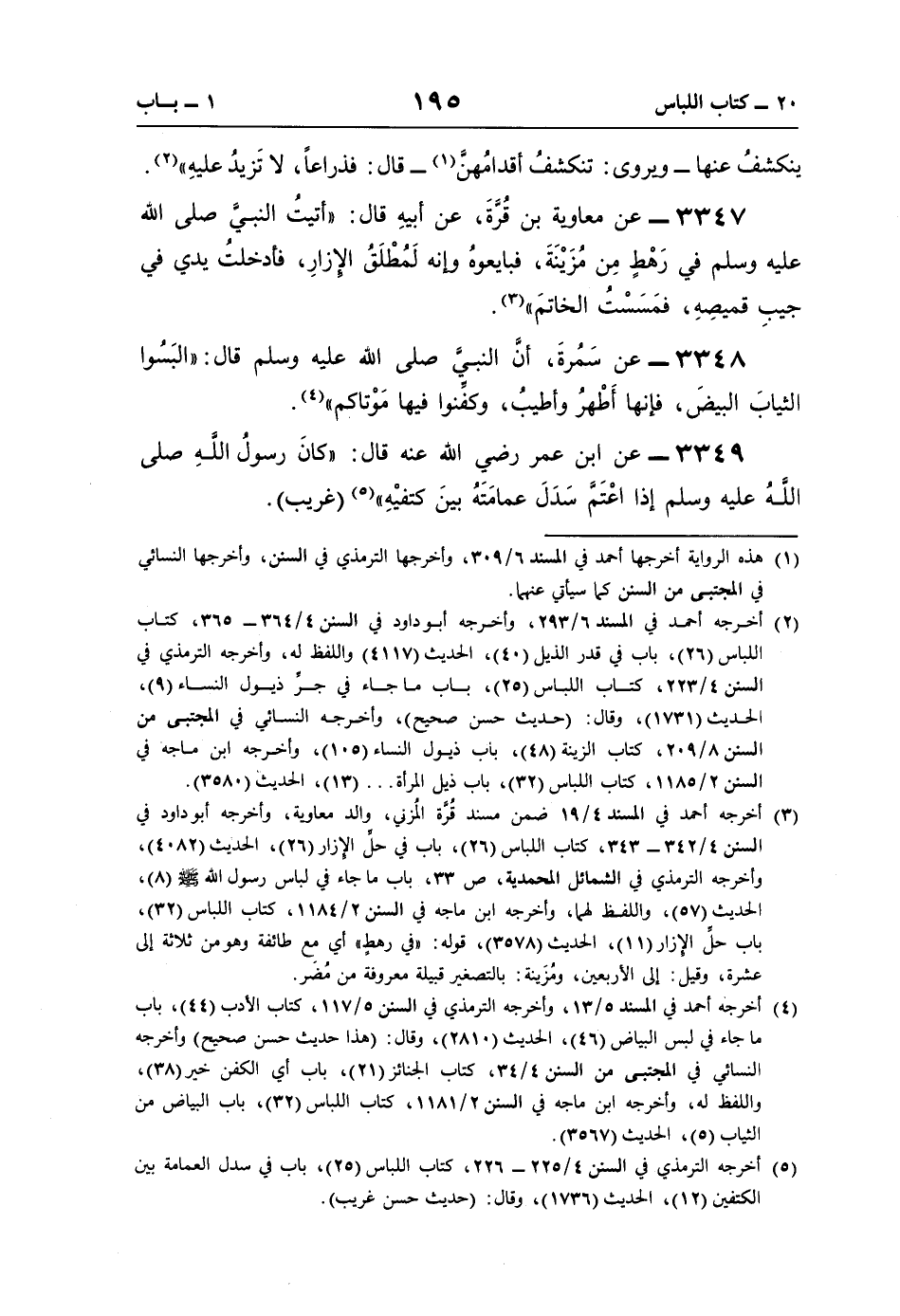 3349 - عن ابن عمر رضي اللَّه عنه قال: "كانَ رسولُ اللَّهِ صلى اللَّهُ عليه وسلم إذا اعْتَمَّ سَدَلَ عمامَتَهُ بينَ كتفيْهِ" (¬5) (غريب).