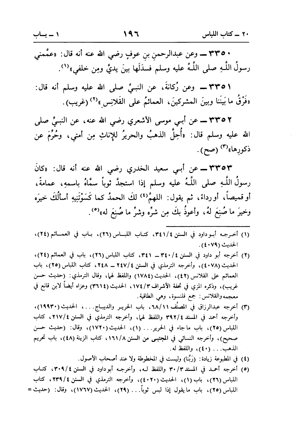3353 - عن أبي سعيد الخدري رضي اللَّه عنه أنّه قال: "كانَ رسولُ اللَّهِ صلى اللَّهُ عليه وسلم إذا استجدَّ ثوبًا سمَّاهُ باسمهِ، عمامةً، أو قميصًا، أو رداءً، ثمَّ يقول: اللَّهمَّ (¬4) لكَ الحمدُ كما كَسَوْتَنِيهِ أسألُكَ خيرَه وخيرَ ما صُنِعَ لهُ، وأعوذُ بكَ مِن شرَه وشرِّ ما صُنِعَ له" (¬5).