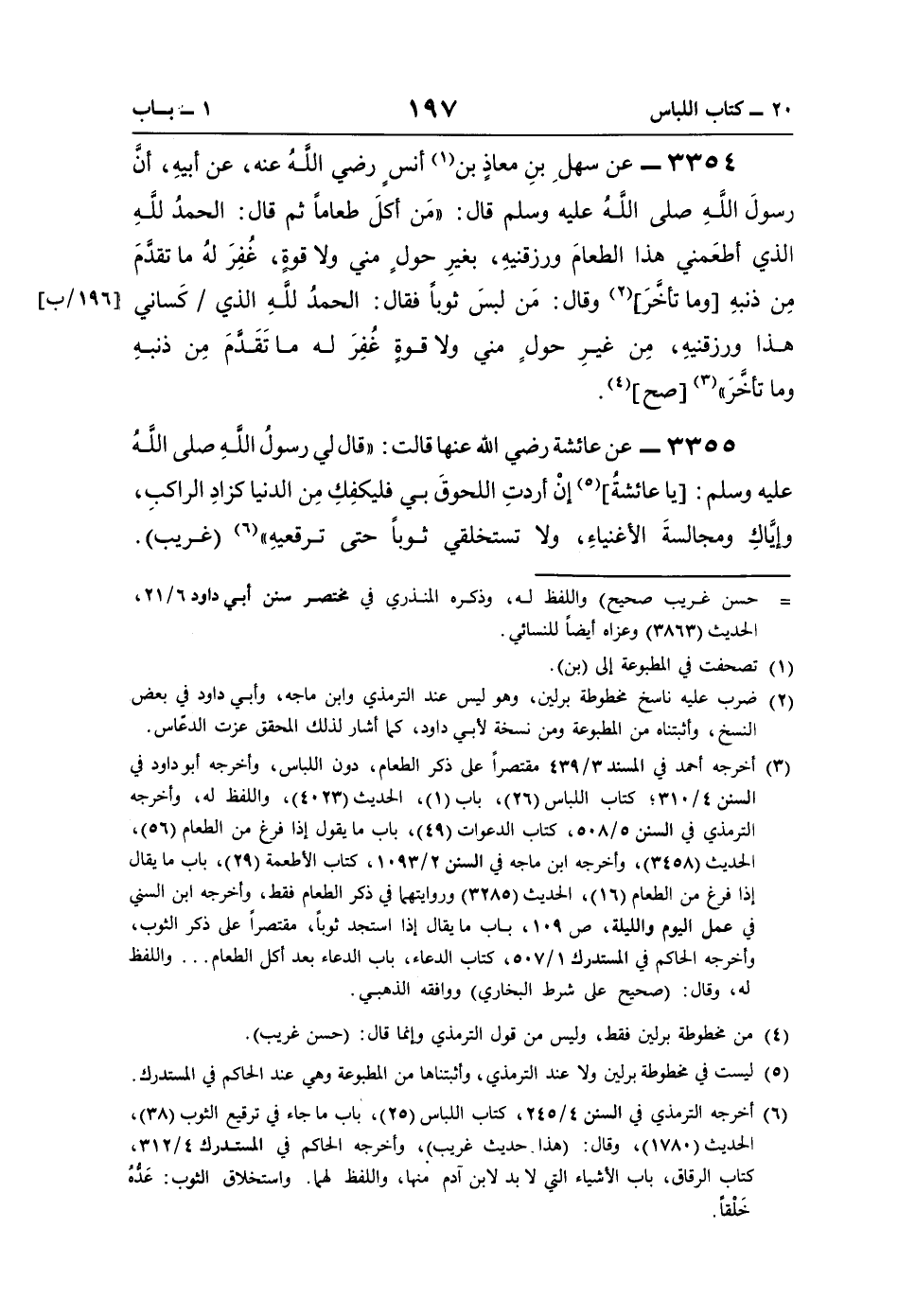 3354 - عن سهلِ بنِ معاذٍ بن (¬1) أنس رضي اللَّه عنه، عن أبيهِ، أنَّ رسولَ اللَّهِ صلى اللَّهُ عليه وسلم قال: "مَن أكلَ طعامًا ثم قال: الحمدُ للَّهِ الذي أطعَمني هذا الطعامَ ورزقنيهِ، بغيرِ حولٍ مني ولا قوةٍ، غُفِرَ لهُ ما تقدَّمَ مِن ذنبهِ [وما تأخَّرَ] (¬2) وقال: مَن لبسَ ثوبًا فقال: الحمدُ للَّهِ الذي كَساني هذا ورزقنيهِ، مِن غيرِ حولٍ مني ولا قوةٍ غُفِرَ له ما تَقَدَّمَ مِن ذنبهِ وما تأخَّرَ" (¬3) [صح] (¬4).