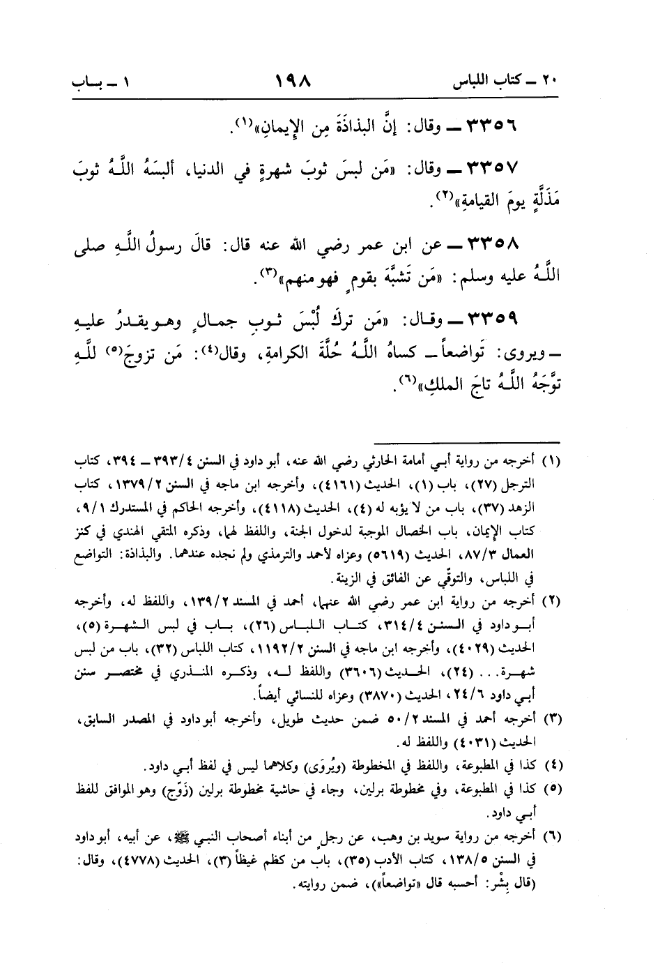 3358 - عن ابن عمر رضي اللَّه عنه قال: قالَ رسولُ اللَّهِ صلى اللَّهُ عليه وسلم: "مَن تَشبَّهَ بقومٍ فهو منهم" (¬3).