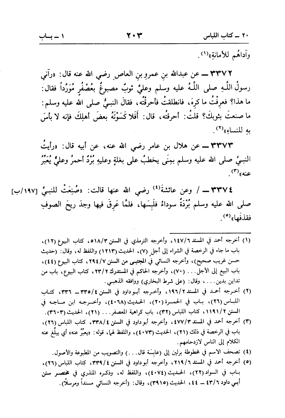(¬2) أخرجه أحمد في المسند 2/ 196، وأخرجه أبو داود في السنن 4/ 335 - 336، كتاب اللباس (26)، باب في الحمرة (20)، الحديث (4068)، وأخرجه ابن ماجه في السنن 2/ 1191، كتاب اللباس (32)، باب كراهية المعصفر. . . (21)، الحديث (3603).