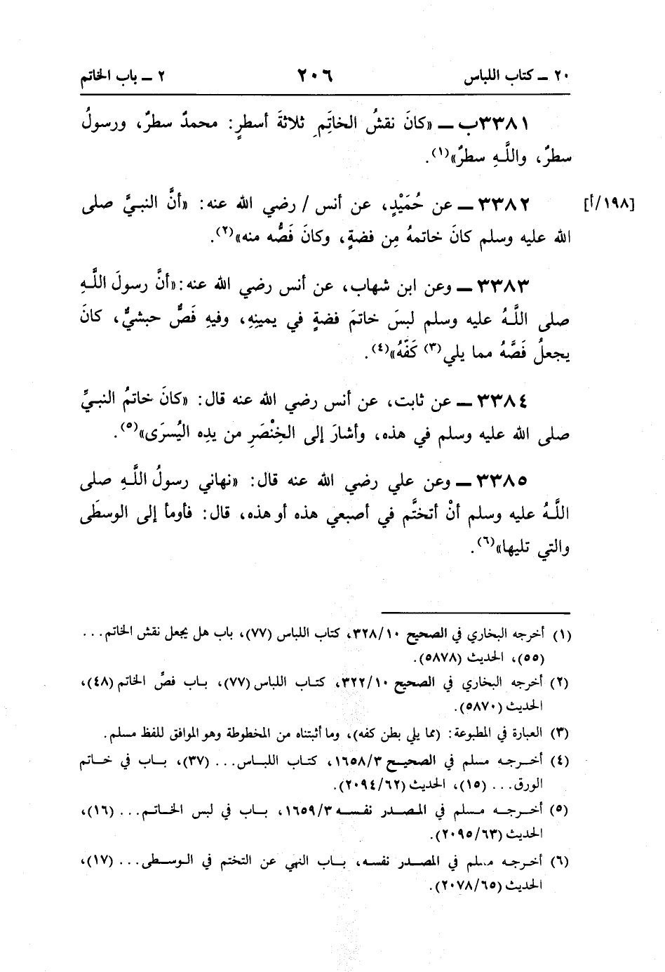 3384 - عن ثابت، عن أنس رضي اللَّه عنه قال: "كانَ خاتمُ النَّبيِّ صلى اللَّه عليه وسلم في هذه، وأشارَ إلى الخِنْصَرِ من يدِه اليُسرَى" (¬5).