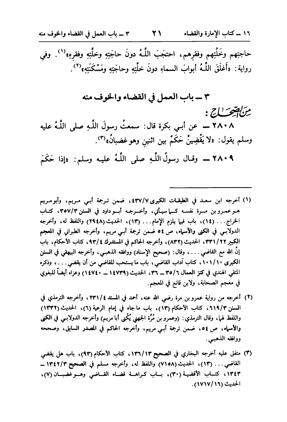2808 - عن أبي بكرة قال: سمعتُ رسولَ اللَّهِ صلى اللَّهُ عليه وسلم يقول: "لا يَقْضِينَّ حَكَمٌ بين اثنين وهو غضبانُ" (¬3).