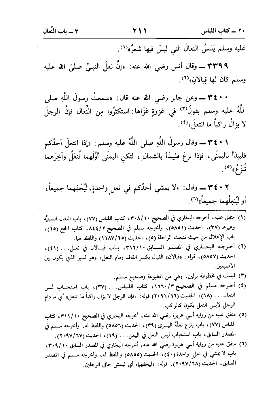 3402 - وقال: "لا يمشي أحدُكم في نعلٍ واحدةٍ، ليُحْفِهما جميعًا، أو ليُنعِلْهما جميعًا" (¬6).