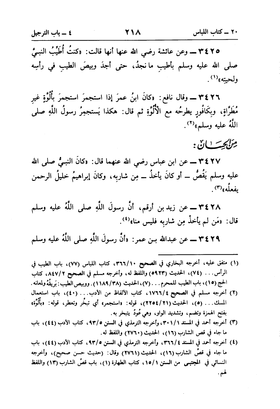 3425 - وعن عائشة رضي اللَّه عنها أنها قالت: "كنتُ أُطَيِّبُ النبيَّ صلى اللَّه عليه وسلم بأطيبِ ما نجدُ، حتَّى أجدَ وبيصَ الطيبِ في رأسِه ولحيتِه" (¬1).