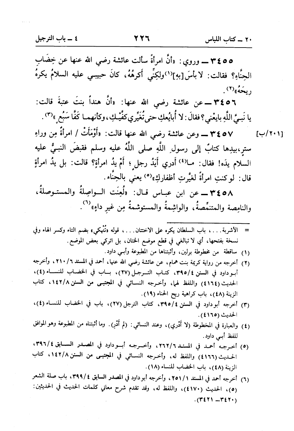 3457 - وعن عائشة رضي اللَّه عنها قالت: "أَوْمَأَتْ امرأةٌ مِن وراءِ سترٍ، بيدِها كتابٌ إلى رسولِ اللَّهِ صلى اللَّهُ عليه وسلم فقبضَ النبيُّ عليه السلام يدَه! فقال: ما (¬4) أَدري أَيَدُ رجلٍ؛ أَمْ يدُ امرأةٍ؟ قالت: بل يدُ امرأةٍ قال: لو كنتِ امرأةً لغيَّرتِ أظفاركِ" (¬5) يعني بالحِنَّاء.