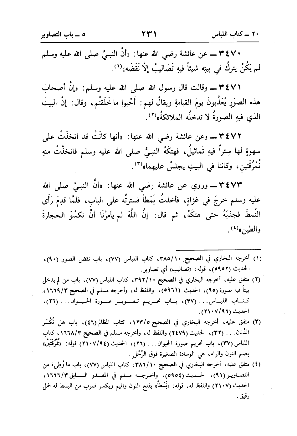 3473 - وروي عن عائشة رضي اللَّه عنها: "أنَّ النبيَّ صلى اللَّه عليه وسلم خرجَ في غزاةٍ، فأخذتُ نِمَطًا فسترتُه على البابِ، فلمَّا قدِمَ رَأَى النَّمطَ فجذبَهُ حتَّى هتكَهُ، ثمَّ قال: إنَّ اللَّهَ لم يأمرْنَا أنْ نكسُوَ الحجارةَ والطين" (¬4).