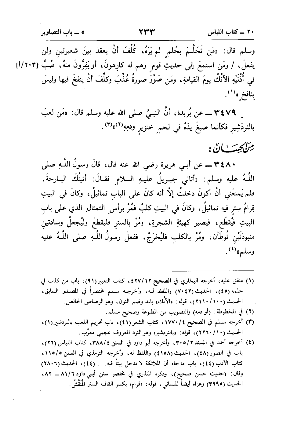 3480 - عن أبي هريرة رضي اللَّه عنه قال، قالَ رسولُ اللَّهِ صلى اللَّهُ عليه وسلم: "أتاني جبريلُ عليهِ السلامِ فقالَ: أتيتُكَ البارحةَ، فلم يَمنعْني أنْ أكونَ دخلتُ إلَّا أنه كانَ على البابِ تماثيلُ، وكانَ في البيتِ قِرامُ سِترٍ فيهِ تماثيلُ، وكانَ في البيتِ كلبٌ فمُرْ برأسِ التمثالِ الذي على بابِ البيتِ فيُقطَع، فيصير كهيئةِ الشجرةِ، ومُرْ بالسترِ فليقطعْ وليُجعلْ وسادتينِ منبوذتَيْنِ تُوطَآن، ومُرْ بالكلبِ فليُخرَجْ، ففعلَ رسولُ اللَّهِ صلى اللَّهُ عليه وسلم" (¬4).