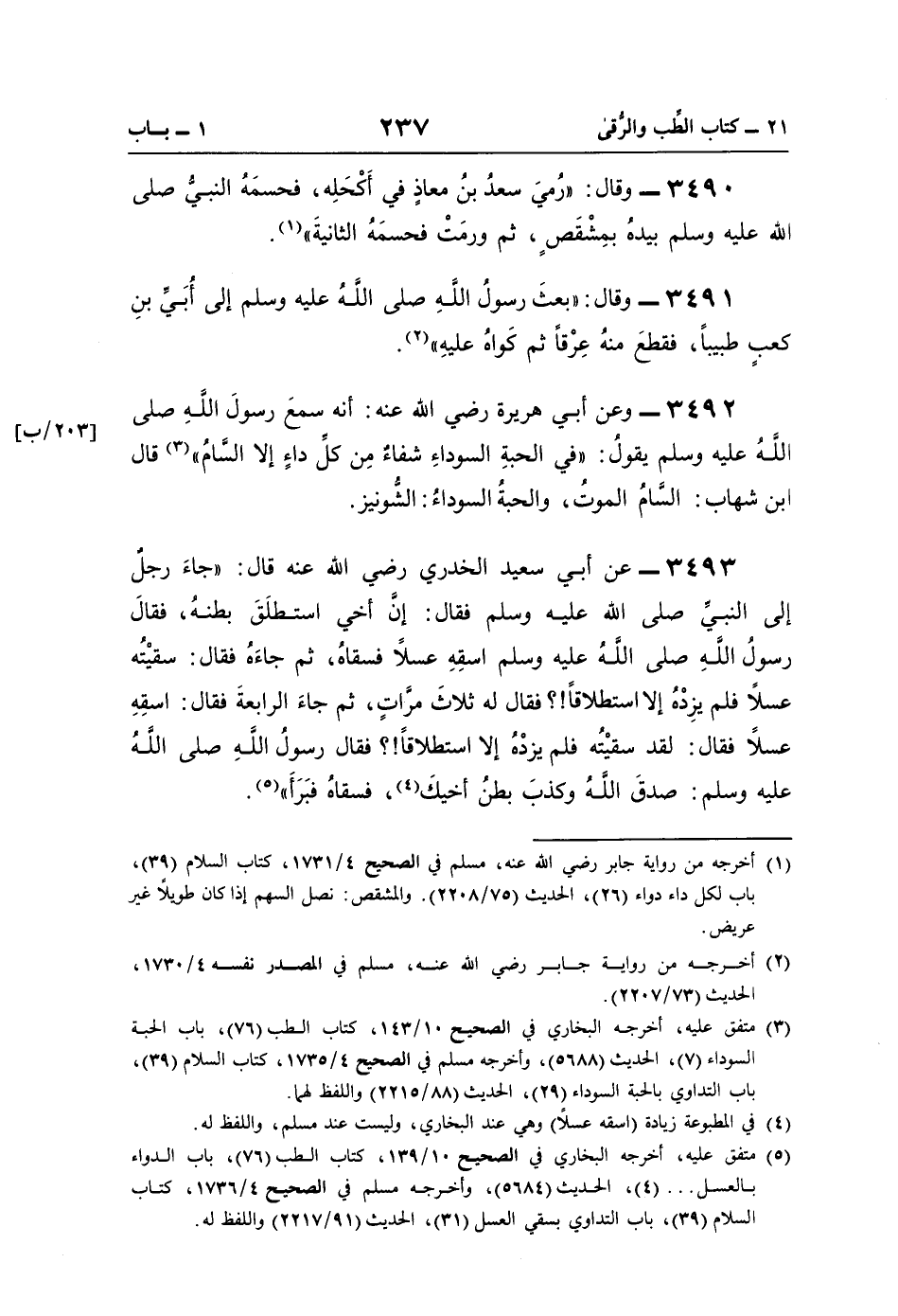 3493 - عن أبي سعيد الخدري رضي اللَّه عنه قال: "جاءَ رجلٌ إلى النَّبيِّ صلى اللَّه عليه وسلم فقال: إنَّ أخي استطلَقَ بطنهُ، فقالَ رسولُ اللَّهِ صلى اللَّهُ عليه وسلم اسقِهِ عسلًا فسقاهُ، ثمَّ جاءَهُ فقال: سقيْتُه عسلًا فلم يزِدْة إلّا استطلاقًا!؟ فقال له ثلاثَ مرَّاتٍ، ثمَّ جاءَ الرابعةَ فقال: اسقِهِ عسلًا فقال: لقد سقيْتُه فلم يزدْة إلّا استطلاقًا!؟ فقال رسولُ اللَّهِ صلى اللَّهُ عليه وسلم: صدقَ اللَّهُ وكذبَ بطنُ أخيكَ (¬4)، فسقاهُ فبَرَأَ" (¬5).
