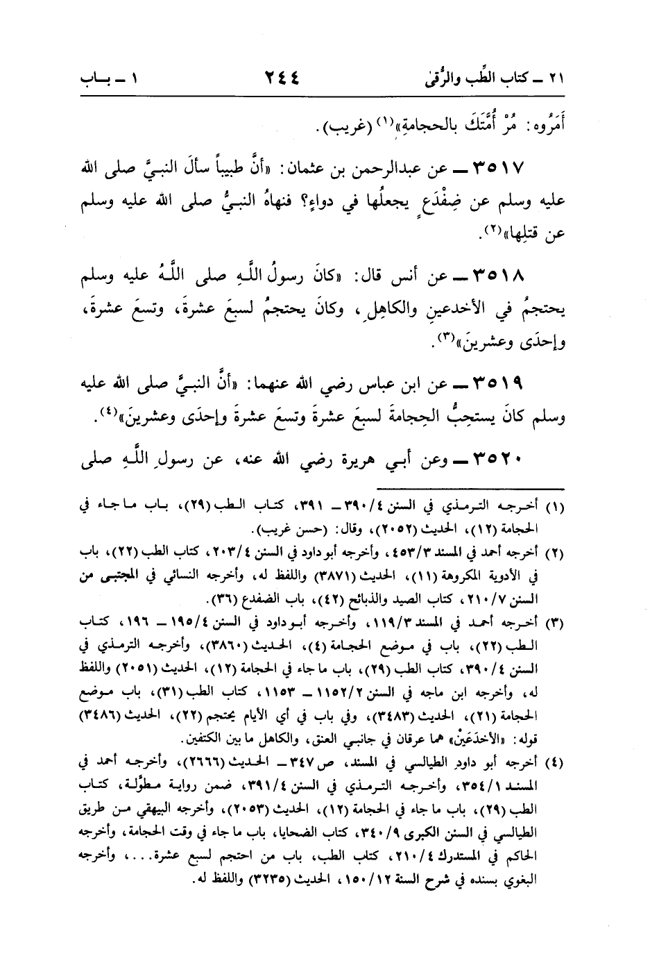 3518 - عن أنس قال: "كانَ رسولُ اللَّهِ صلى اللَّهُ عليه وسلم يحتجمُ في الأخدعينِ والكاهِلِ، وكانَ يحتجمُ لسبعَ عشرةَ، وتسعَ عشرةَ، وإحدَى وعشرينَ" (¬3).