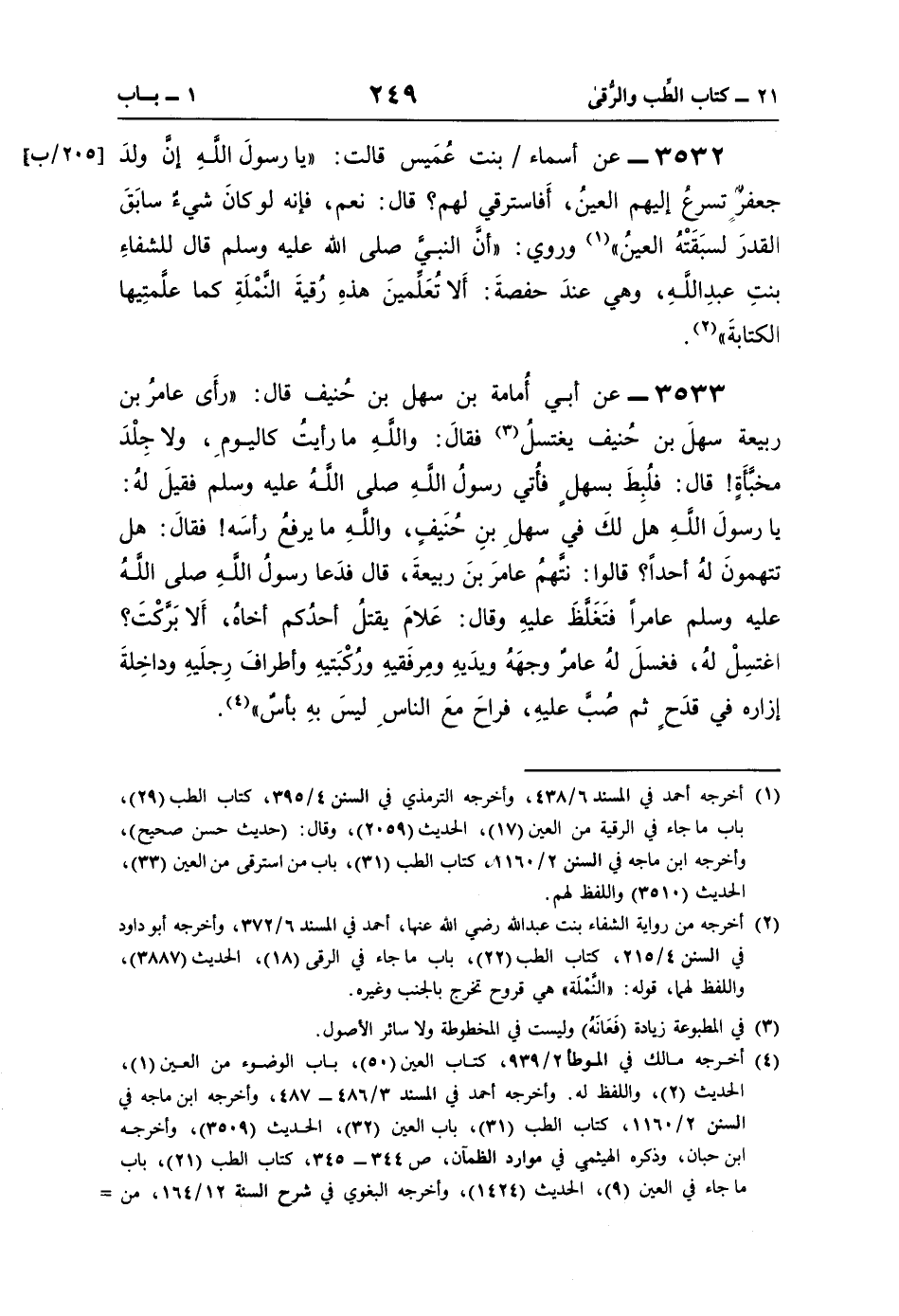 3533 - عن أبي أُمامة بن سهل بن حُنيف قال: "رأَى عامرُ بن ربيعة سهلَ بن حُنيف يغتسلُ (¬3) فقالَ: واللَّهِ ما رأيتُ كاليومِ، ولا جِلْدَ مخبَّأَةٍ! قال: فلُبِطَ بسهلٍ فأُتي رسولُ اللَّهِ صلى اللَّهُ عليه وسلم فقيلَ لهُ: يا رسولَ اللَّهِ هل لكَ في سهلِ بنِ حُنَيفٍ، واللَّهِ ما يرفعُ رأسَه! فقالَ: هل تتهمونَ لهُ أحدًا؟ قالوا: نتَّهمُ عامرَ بنَ ربيعةَ، قال فدَعا رسولُ اللَّهِ صلى اللَّهُ عليه وسلم عامرًا فتَغَلَّظَ عليهِ وقال: عَلامَ يقتلُ أحدُكم أخاهُ، أَلا بَرَّكْتَ؟ اغتسِلْ لهُ، فغسلَ لهُ عامرٌ وجهَهُ ويدَيهِ ومِرفَقيهِ ورُكْبَتيهِ وأطرافَ رِجلَيهِ وداخِلةَ إزاره في قدَحٍ ثم صُبَّ عليهِ، فراحَ معَ الناسِ ليسَ بهِ بأسٌ" (¬4).