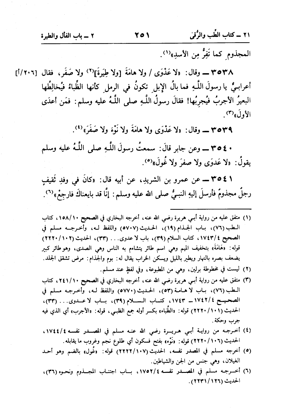 3539 - وقال: "لا عَدْوَى ولا هامَةَ ولا نَؤءَ ولا صَفَرَ" (¬4).