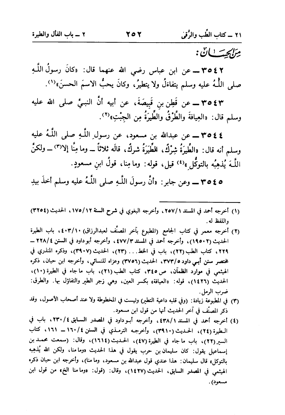 (¬3) في المطبوعة زيادة: (وفي قلبه داعية التطير) وليست في المخطوطة ولا عند أصحاب الأصول، وقد ذكر المصنّف في آخر الحديث أنها من قول ابن مسعود.