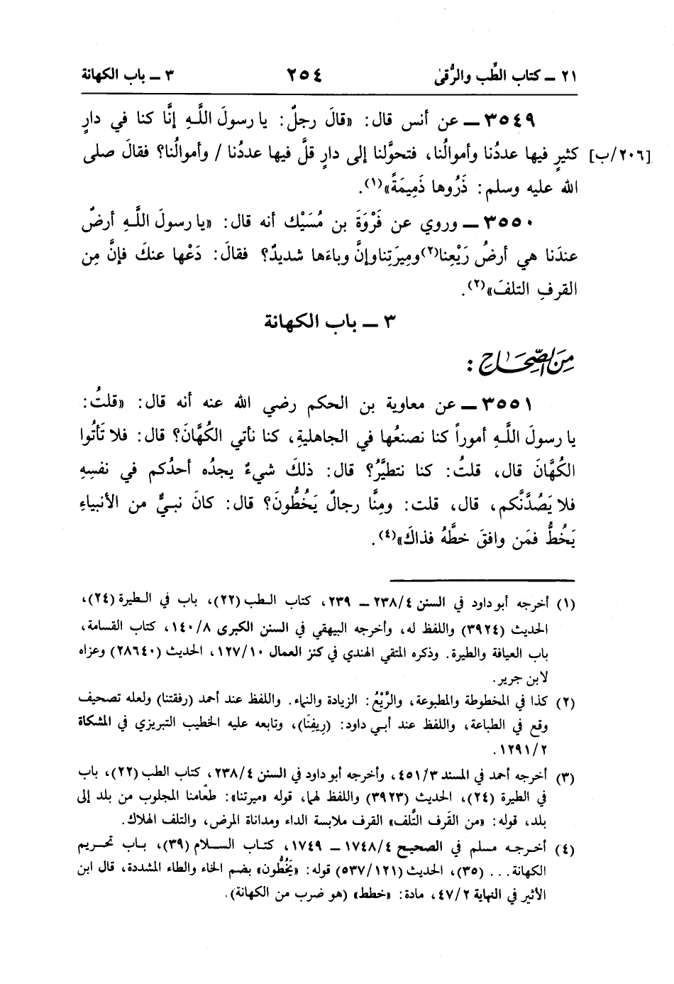 3551 - عن معاوية بن الحكم رضي اللَّه عنه أنّه قال: "قلتُ: يا رسولَ اللَّهِ أمورًا كنا نصنعُها في الجاهليةِ، كنا نأتي الكُهَّانَ؟ قال: فلا تَأتوا الكُهَّانَ قال، قلتُ: كنا نتطيَّرُ؟ قال: ذلكَ شيءٌ يجدُه أحدُكم في نفسِهِ فلا يَصُدَّنَّكم، قال، قلت: ومِنَّا رجالٌ يَخُطُّونَ؟ قال: كانَ نبيٌّ من الأنبياءِ يَخُطُّ فمَن وافقَ خطَّهُ فذاكَ" (¬4).