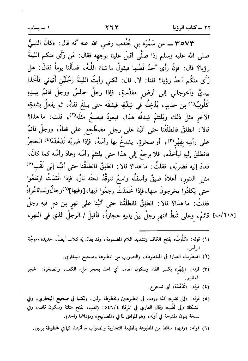 3573 - عن سَمُرَة بنِ جُنْدب رضي اللَّه عنه أنّه قال: "كانَ النبيُّ صلى اللَّه عليه وسلم إذا صلَّى أقبلَ علينا بوجهِه فقال: مَن رَأَى منكم الليلةَ رؤيا؟ قال: فإنْ رَأَى أحدٌ قَصَّها فيقولُ ما شاءَ اللَّهُ، فسأَلَنا يومًا فقالَ: هل رَأَى منكم أحدٌ رؤيا؟ قلنا: لا، قال: لكني رأيتُ الليلةَ رَجُلَيْنِ أَتَياني فأَخَذا بيديَّ وأخرجاني إلى أرضٍ مقدَّسةٍ، فإذا رجلٌ جالسٌ ورجلٌ قائمٌ بيدِهِ كَلُّوبٌ (¬1) مِن حديدٍ، يُدْخِلُه في شِدْقِه فيشقَه حتَّى يبلغَ قفاهُ، ثمَّ يفعلُ بشدقِه الآخرِ مثلَ ذلكَ ويَلتئمُ شِدقُه هذا، فيعودُ فيصنعُ مثلَه (¬2)، قلت: ما هذا؟ قالا: انطلِقْ فانطلَقْنا حتَّى أتيْنا على رجلٍ مضطَجِعٍ على قفاهُ، ورجلٌ قائمٌ على رأسِه بِفِهْرٍ (¬3)، أو صخرةٍ، يشدخُ بها رأسَهُ، فإذا ضربَه تَدَهْدَهَ (¬4) الحجرُ فانطلقَ إليهِ ليأخذَه، فلا يرجعُ إلى هذا حتَّى يلتئمَ رأسُه وعادَ رأسُه كما كانَ، فعادَ إليه فضربَه، فقلتُ: ما هذا؟ قالا: انطلِقْ فانطلَقْنا حتَّى أتيْنا إلى نَقْبٍ (¬5) مثلِ التنورِ، أَعلاهُ ضيقٌ وأسفلُه واسعٌ تتوقَّدُ تحتَه نارٌ، فإذا اتَّقدَتْ ارتفَعُوا حتَّى يَكادُوا يخرجونَ منها، فإذا خَمَدَتْ رجعُوا فيها، [وفيها] (¬6) رجالٌ ونساءٌ عُراةٌ فقلت: ما هذا؟ قالا: انطلِقْ فانطلَقْنا حتَّى أتيْنا على نهرٍ مِن دمٍ فيهِ رجلٌ قائمٌ، وعلى شَطِّ النهرِ رجلٌ بينَ يديهِ حجارةٌ، فأقبلَ الرجلُ الذي في النهرِ،