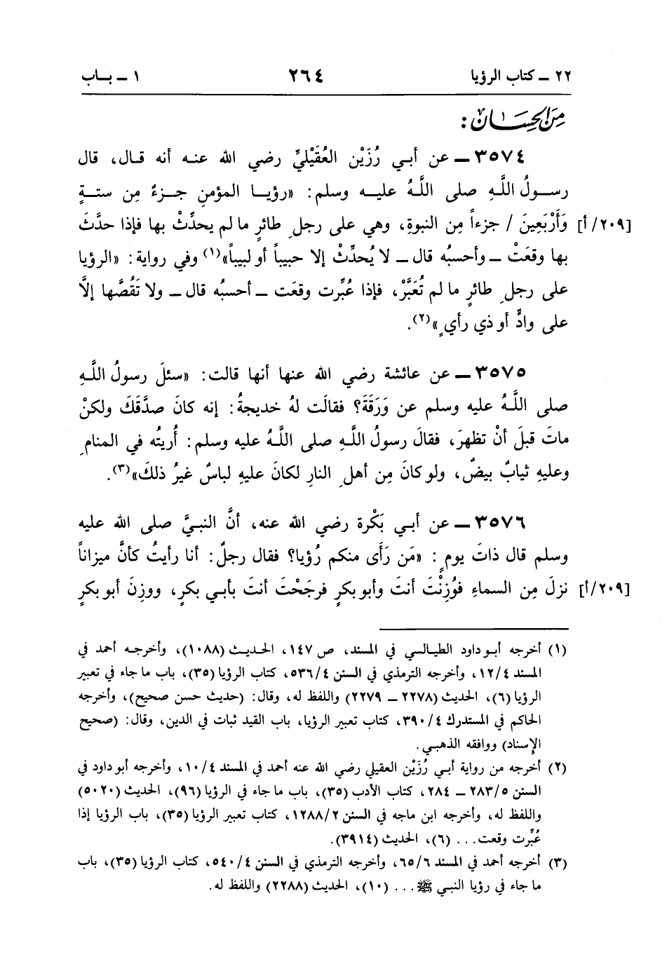 3574 - عن أبي رُزَيْن العُقَيْليِّ رضي اللَّه عنه أنّه قال، قال رسولُ اللَّهِ صلى اللَّهُ عليه وسلم: "رؤيا المؤمنِ جزءٌ مِن ستةٍ وَأَرْبَعِينَ جزءًا مِن النبوةِ، وهي على رجلِ طائرٍ ما لم يحدِّثْ بها فإذا حدَّثَ بها وقعَتْ -وأحسبُه قال- لا يُحدِّثْ إلّا حبيبًا أو لبيبًا" (¬1) وفي رواية: "الرؤيا على رجلِ طائرٍ ما لم تُعَبَّرْ، فإذا عُبِّرت وقعَت -أحسبُه قال- ولا تَقُصَّها إلَّا على وادٍّ أو ذي رأيٍ" (¬2).