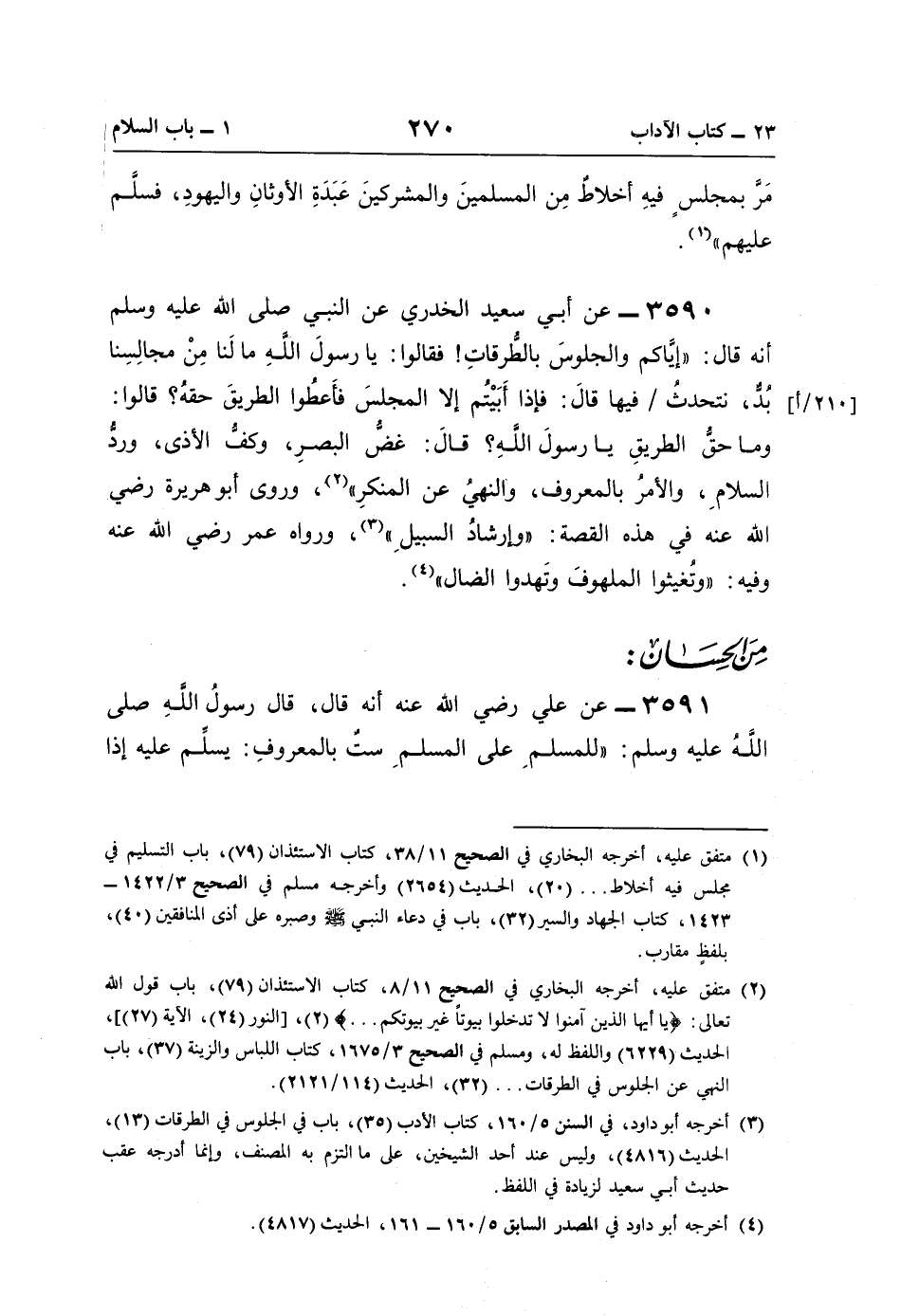3590 - عن أبي سعيد الخدري عن النَّبيّ صلى اللَّه عليه وسلم أنّه قال: "إيَّاكم والجلوسَ بالطُّرقاتِ! فقالوا: يا رسولَ اللَّهِ ما لَنا مِنْ مجالِسِنا بُدٌّ، نتحدثُ فيها قالَ: فإذا أَبَيْتُم إلّا المجلسَ فأَعطُوا الطريقَ حقهُ؟ قالوا: وما حقُّ الطريقِ يا رسولَ اللَّهِ؟ قالَ: غضُّ البصرِ، وكفُّ الأذى، وردُّ السلامِ، والأمرُ بالمعروف، والنهيُ عن المنكرِ" (¬2)، وروى أبو هريرة رضي اللَّه عنه في هذه القصة: "وإرشادُ السبيلِ" (¬3)، ورواه عمر رضي اللَّه عنه وفيه: "وتُغيثوا الملهوفَ وتَهدوا الضال" (¬4).