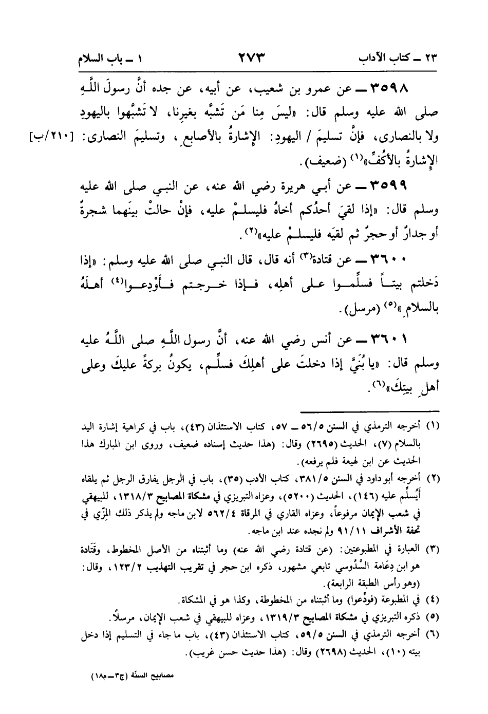 3598 - عن عمرو بن شعيب، عن أبيه، عن جده أنَّ رسولَ اللَّهِ صلى اللَّه عليه وسلم قال: "ليسَ مِنا مَن تَشبَّه بغيرِنا، لا تَشبَّهوا باليهودِ ولا بالنصارى، فإنَّ تسليمَ اليهودِ: الإِشارةُ بالأصابعِ، وتسليمَ النصارى: الإِشارةُ بالأكُفِّ" (¬1) (ضعيف).