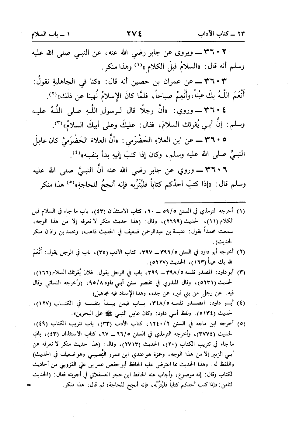 3602 - ويروى عن جابر رضي اللَّه عنه، عن النَّبيّ صلى اللَّه عليه وسلم أنّه قال: "السلامُ قبلَ الكلامِ" (¬1) وهذا منكر.