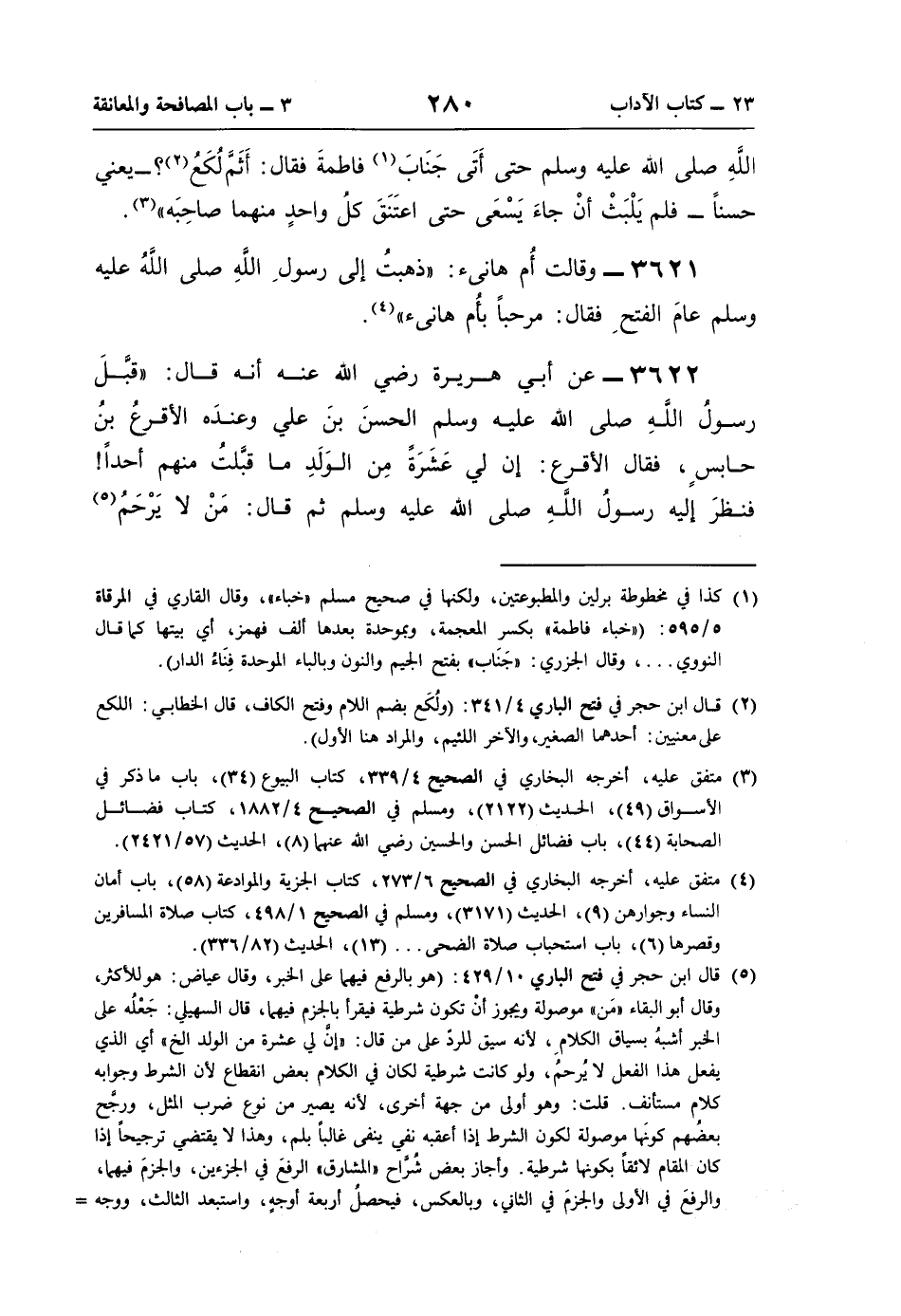3622 - عن أبي هريرة رضي اللَّه عنه أنّه قال: "قبَّلَ رسولُ اللَّهِ صلى اللَّهُ عليه وسلم الحسنَ بنَ علي وعندَه الأقرعُ بنُ حابسٍ، فقال الأقرع: إن لي عَشَرَةً مِن الوَلَدِ ما قبَّلتُ منهم أحدًا! فنظرَ إليه رسولُ اللَّهِ صلى اللَّهُ عليه وسلم ثم قال: مَنْ لا يَرْحَمُ (¬5)