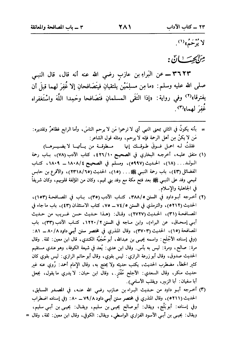 3623 - عن البَراءِ بن غازبٍ رضي اللَّه عنه أنّه قال، قال النبي صلى اللَّه عليه وسلم: "ما مِن مسلِمَيْن يلتقيانِ فيتَصَافحانِ إلّا غُفِرَ لهما قبلَ أن يفترقا" (¬2) وفي رواية: "إذا التَقَى المسلمانِ فتَصَافحا وحَمِدا اللَّهَ واسْتَغفراه غُفِرَ لهما" (¬3).